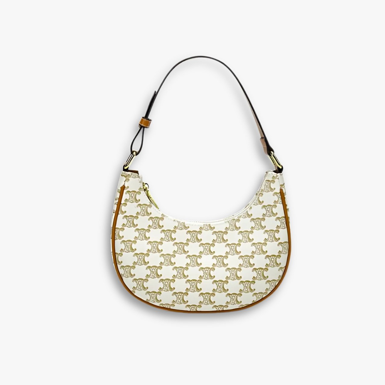 This is a Celine Ava Bag in canvas with the brand’s signature Triomphe monogram print. It features a crescent-shaped silhouette, smooth leather trim in brown, and a short adjustable strap for shoulder or hand carry. The design is chic and versatile, perfect for both casual and dressy occasions.