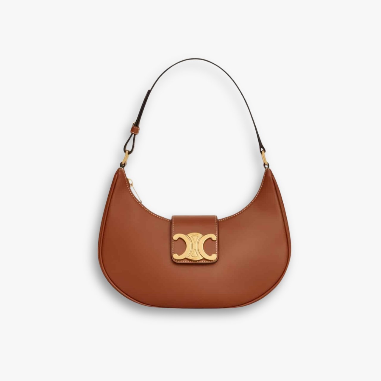 The bag showns with a distinctive crescent shape. It features a gold-tone Triomphe logo on the front flap, which serves as both a decorative element and a clasp. A single shoulder strap is attached to the bag with gold hardware, complementing the logo and completing its sleek design.