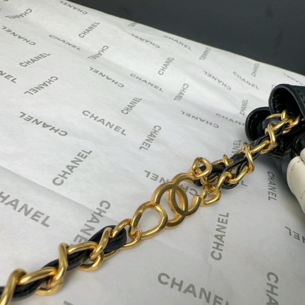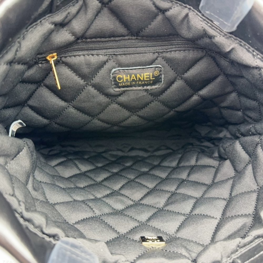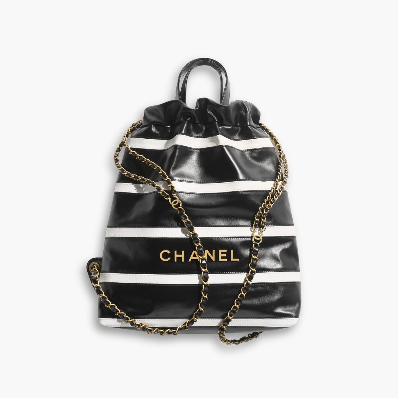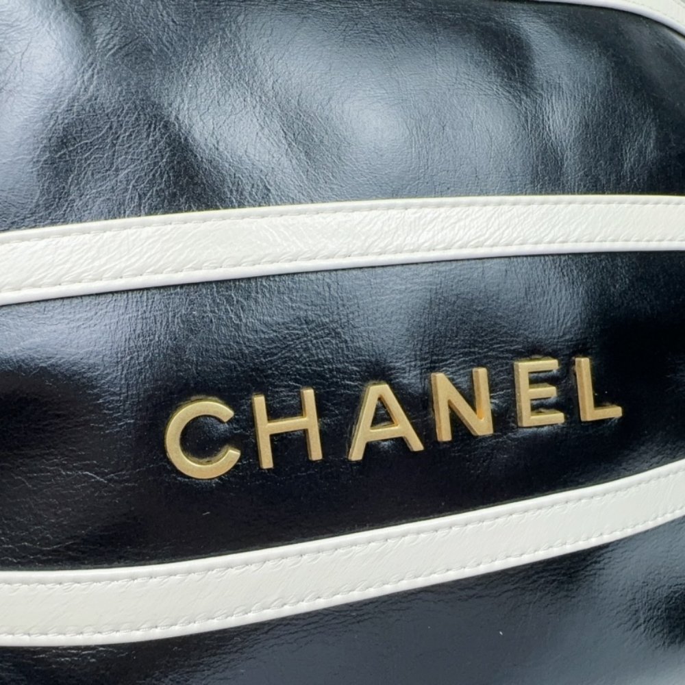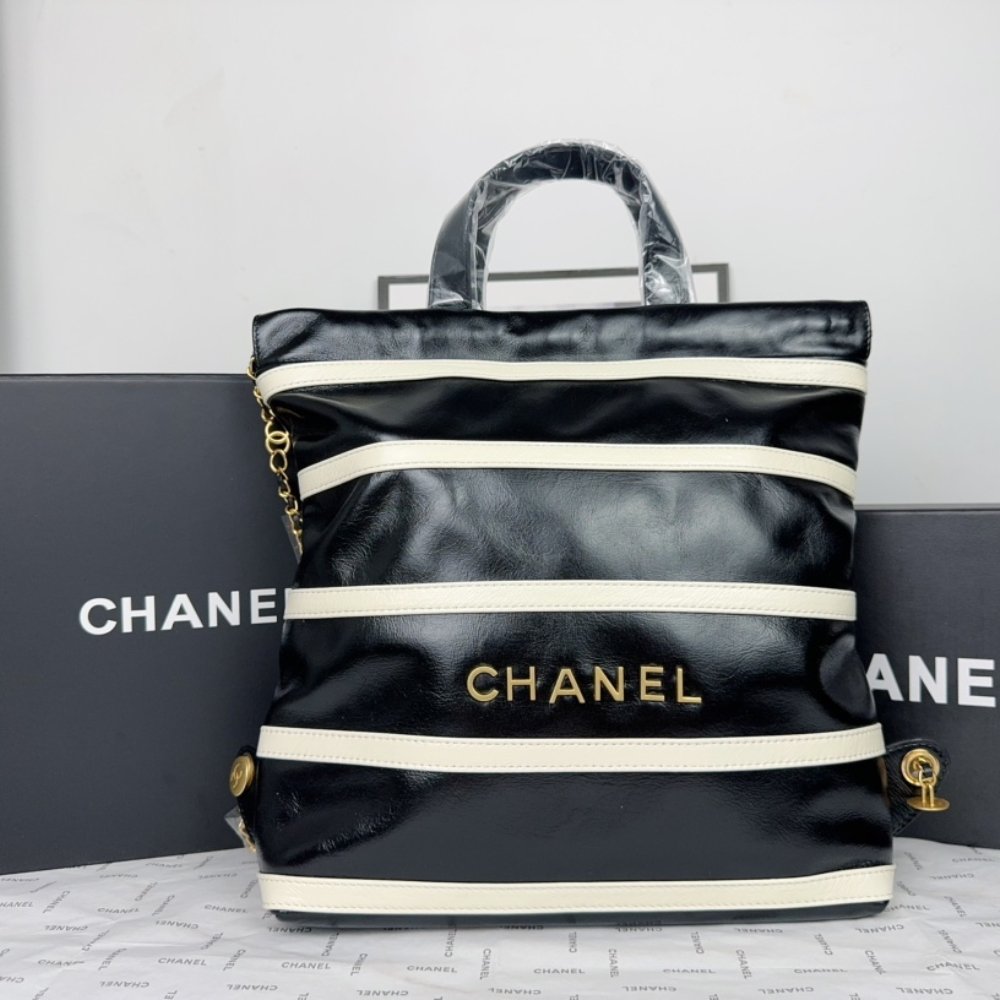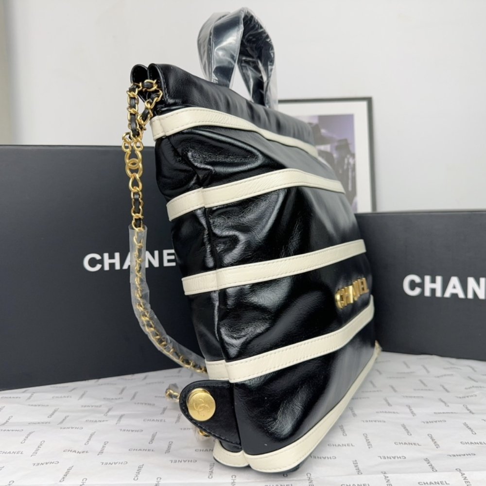 The Chanel 22 Backpack in Black and White combines practicality with high fashion. Crafted from shiny calfskin leather and adorned with gold-tone metal accents, this backpack features a spacious interior and adjustable straps, making it both functional and stylish for everyday use.