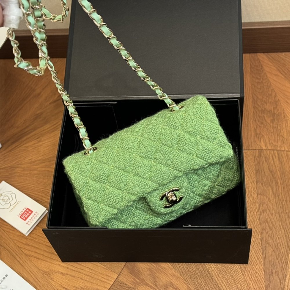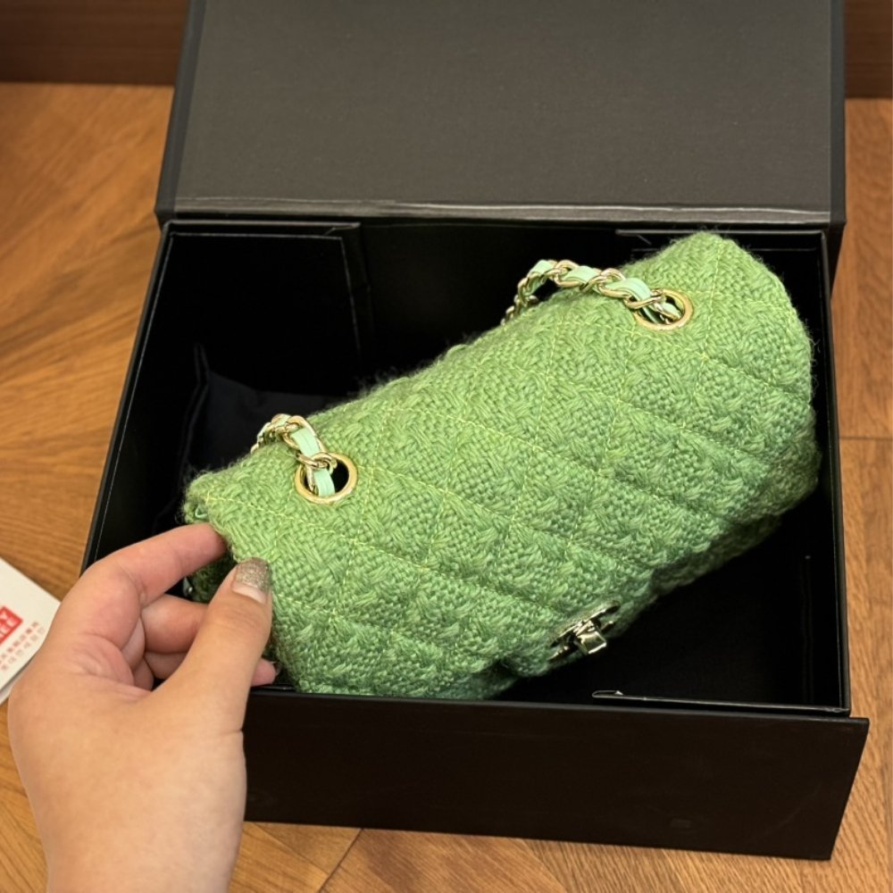 The Chanel Classic Bag in Wool Tweed & Gold Plated Metal combines timeless elegance with practical design. Its luxurious green tweed and gold hardware offer a sophisticated look, while multiple compartments provide convenient storage.