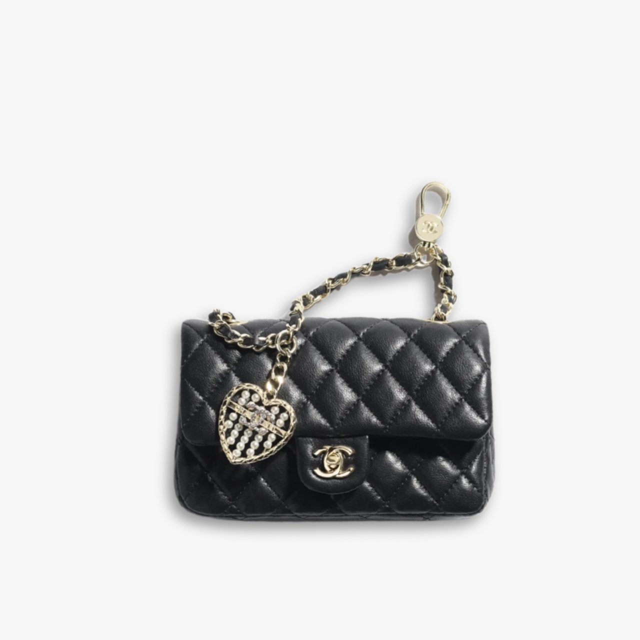 This Chanel mini flap bag has black with gold-tone hardware. It features the iconic CC turn-lock closure and a chic chain handle. A pearl and crystal heart charm adds a touch of elegance and playfulness.