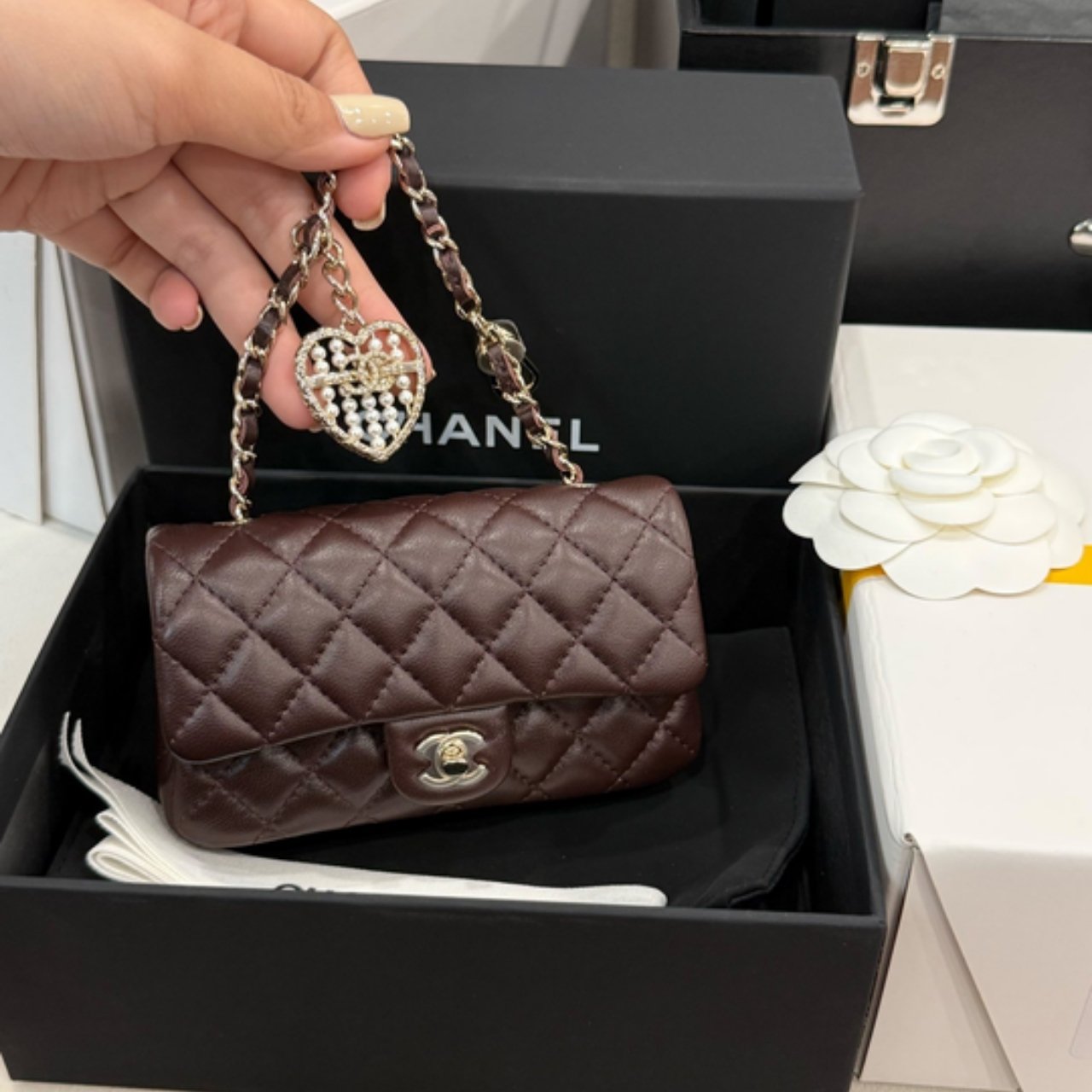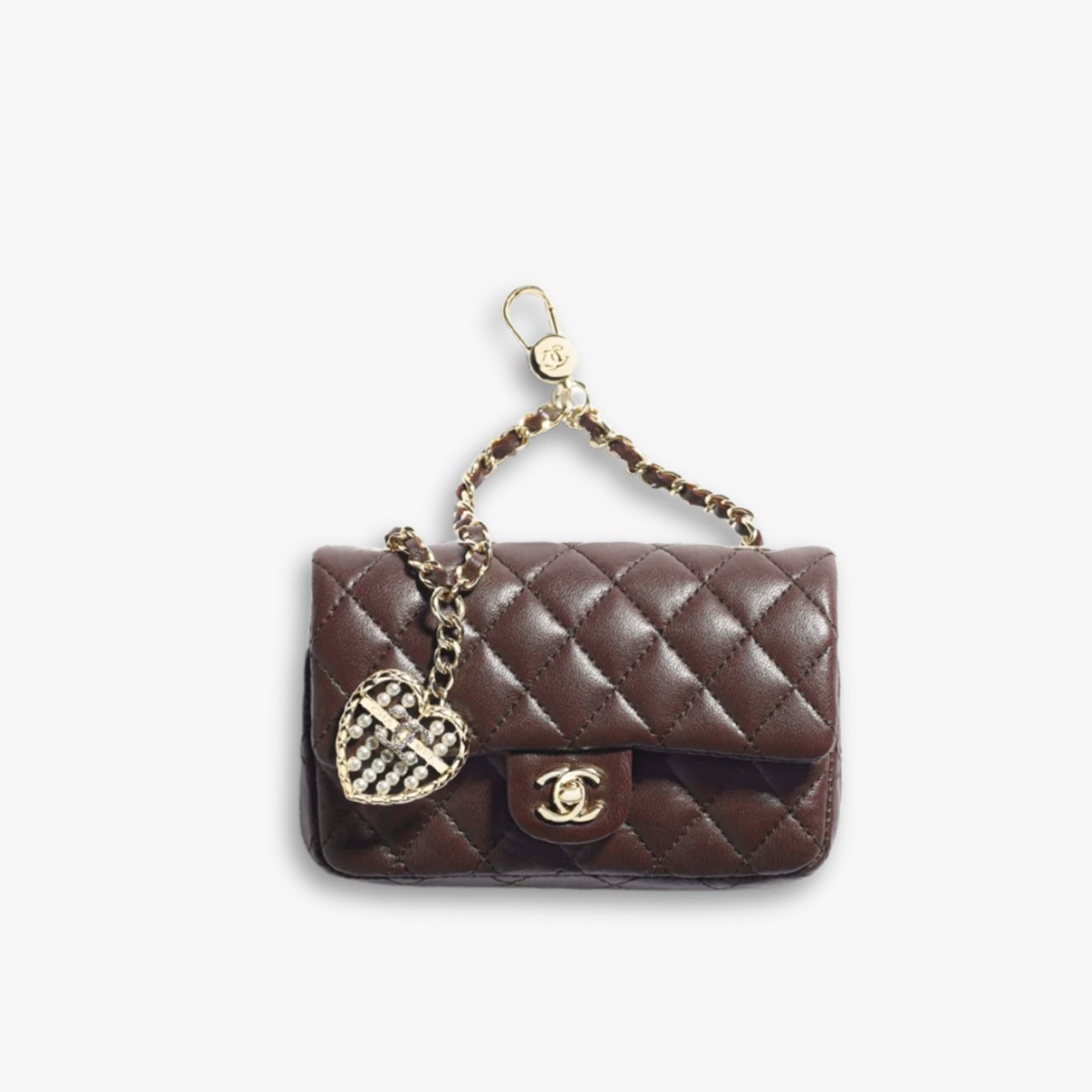 This Chanel mini flap bag has dark brown with gold-tone hardware. It features the iconic CC turn-lock closure and a chic chain handle. A pearl and crystal heart charm adds a touch of elegance and playfulness.