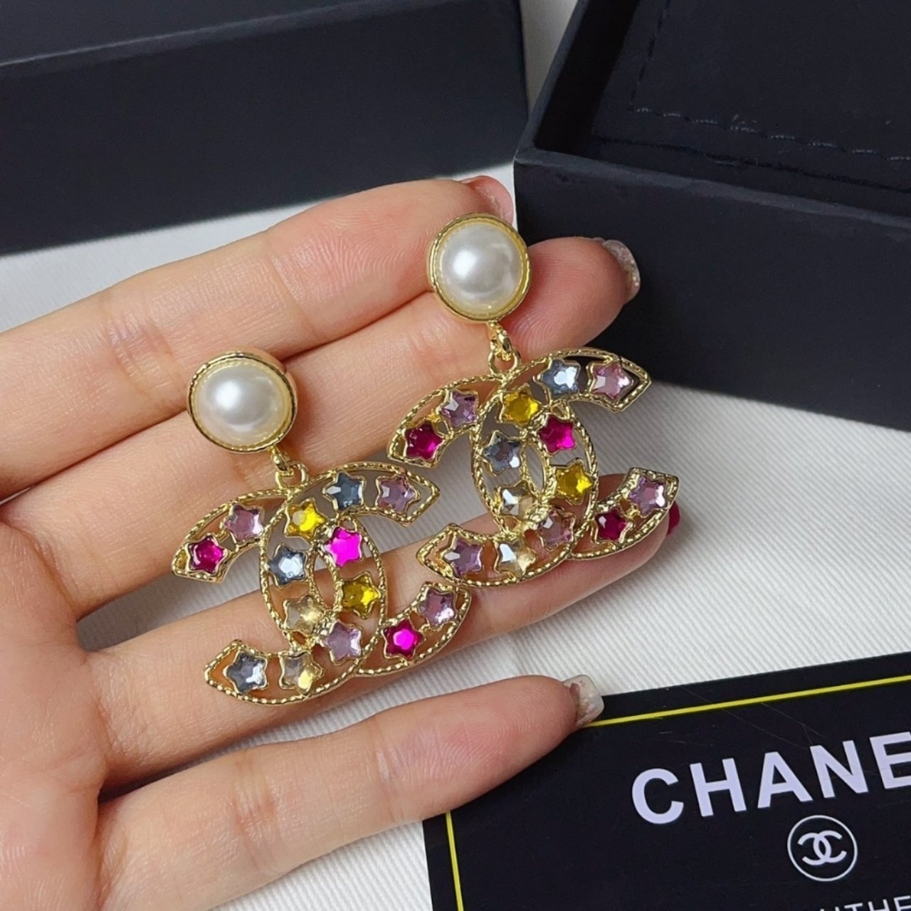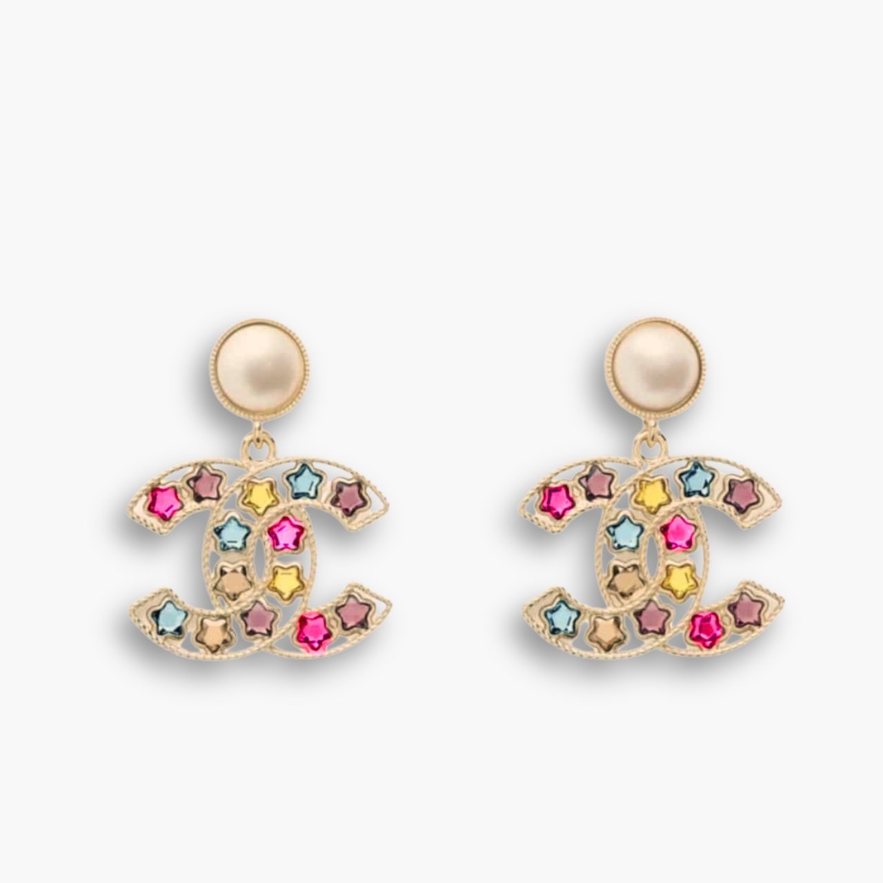 These Chanel earrings burst with playful elegance, featuring the iconic double C logo adorned with multicolored star. The pearl top adds a touch of sophistication, creating a perfect blend of youthful charm and luxury. Ideal for those who love to make a stylish and vibrant statement.
