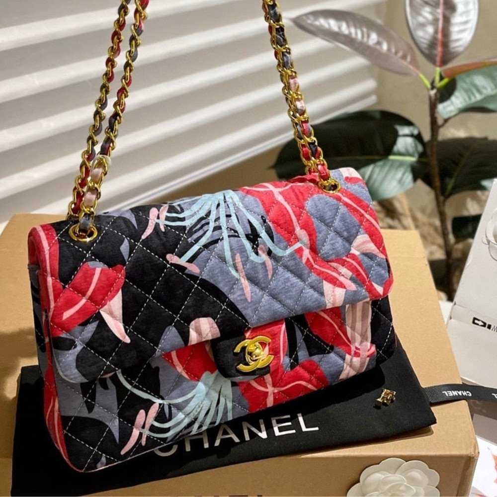 This Chanel Flap Bag blends classic elegance with a bold, artistic twist. Crafted from quilted fabric, it features a vibrant pink multicolor print that adds a playful yet sophisticated touch. The signature gold-tone CC turn-lock and chain-link strap enhance its timeless appeal.