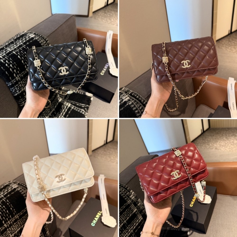 The Chanel Wallet on Chain (WOC) AP4299 in Diamond Quilted Burgundy (20cm) is a sophisticated and versatile accessory. Crafted from luxurious leather with Chanel’s signature diamond quilting, it features a sleek silhouette accented by the iconic CC logo.