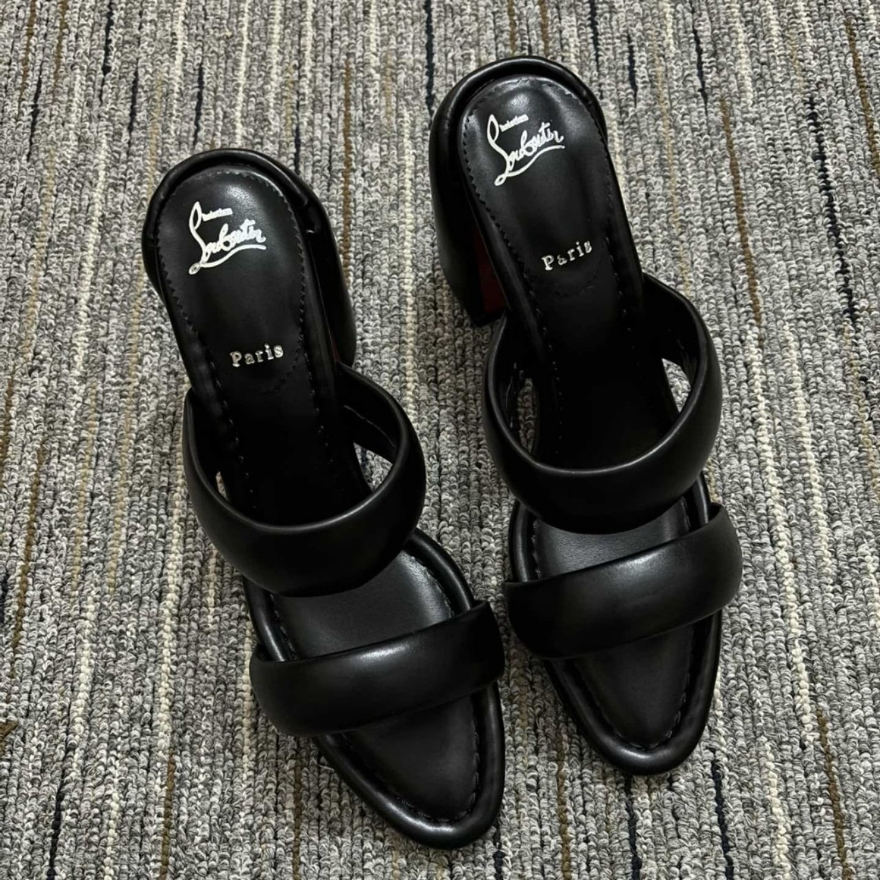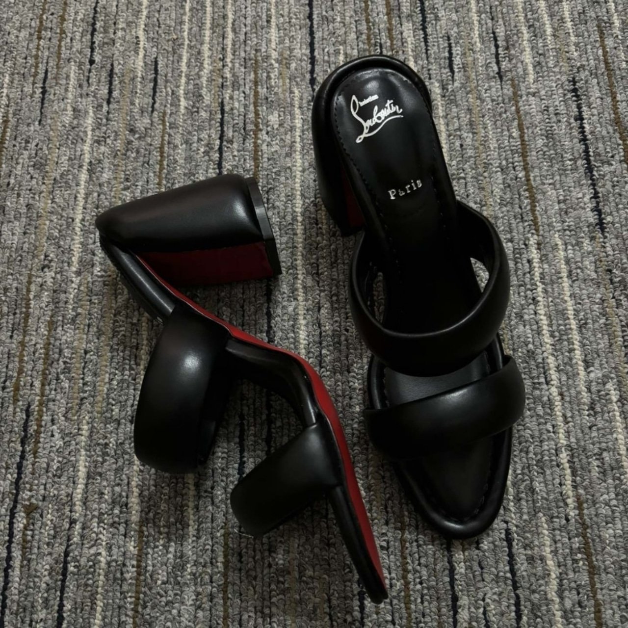 These are Christian Louboutin block heel sandals in smooth black. The design features wide cushioned straps across the foot, an open toe, and a sturdy block heel for comfort and stability. Finished with the iconic red sole, they combine modern elegance with everyday wearability.