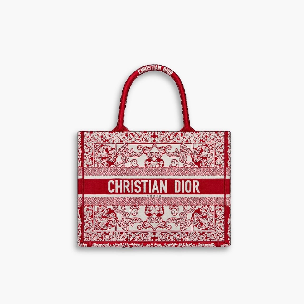 The Dior Book Tote has become a staple of the Dior aesthetic. Designed to hold all the daily essentials, the style is fully embroidered with Toile de Jouy Reverse motif. Adorned with the Christian Dior Paris signature on the front, the medium tote exemplifies the House’s signature savoir-faire and may be carried by hand or worn over the shoulder.
