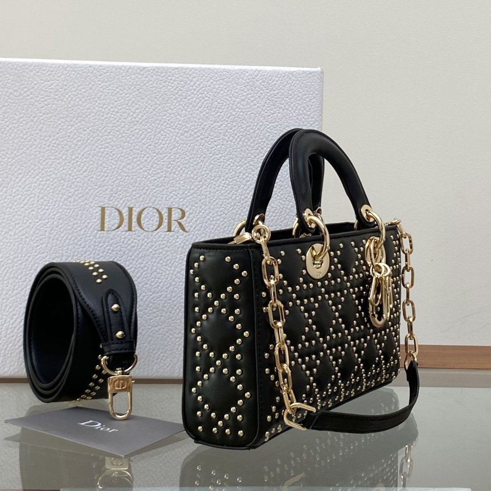 The Lady D-Joy bag embodies Dior’s vision of elegance and beauty. Sleek and refined, the timeless style is crafted in black lambskin embroidered with beads in the hallmark Cannage motif. ‘D.I.O.R.’ charms in pale gold-finish metal encrusted with beads offer an elegant allure. Featuring a removable chain shoulder strap and another adjustable and removable strap in leather, the Lady D-Joy bag can be carried by hand or worn crossbody as a daily companion.