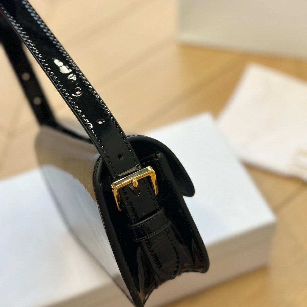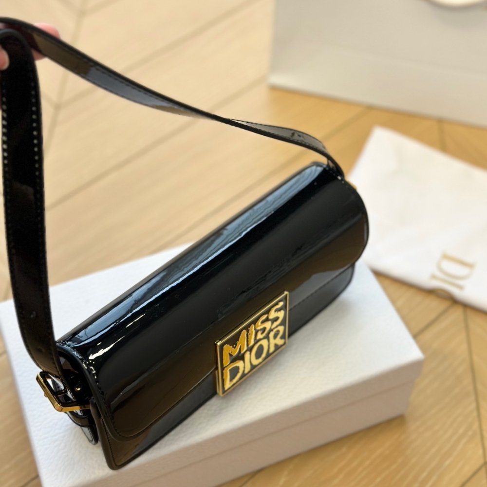 The new Miss Dior flap bag redefines House staples of modern elegance. Crafted in patent calfskin, it has a timeless aesthetic contrasted by a modern enamel plate with the collection’s hallmark Miss Dior Graffiti signature. The flap reveals a main compartment completed by a zip pocket to accommodate all the essentials. Thanks to the adjustable strap, the bag can be worn over the shoulder for a contemporary and couture style.