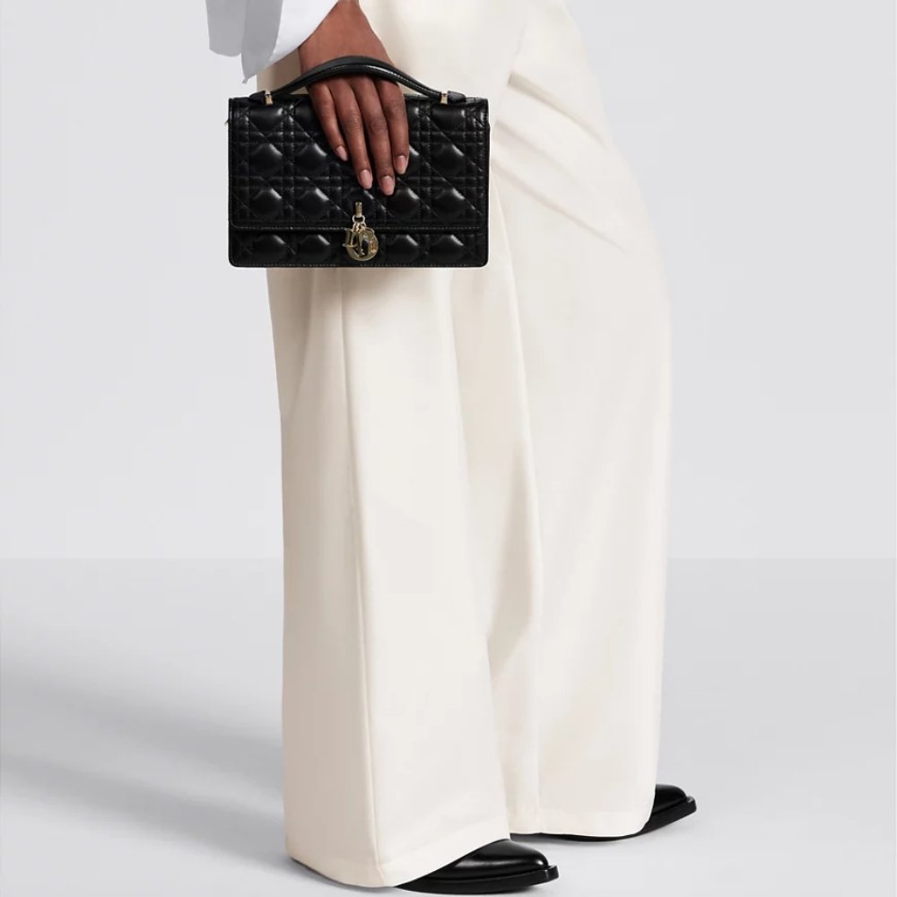 The My Dior Top Handle bag presents an elegant and functional design. The bag is crafted in black lambskin with Cannage stitching and features a flap enhanced by D.I.O.R. charms as well as two compartments and a zip pocket to accommodate all the essentials, day or night. The signature Top Handle is completed by a removable chain strap with a leather insert, allowing it to be comfortably carried by hand, worn over the shoulder or crossbody.