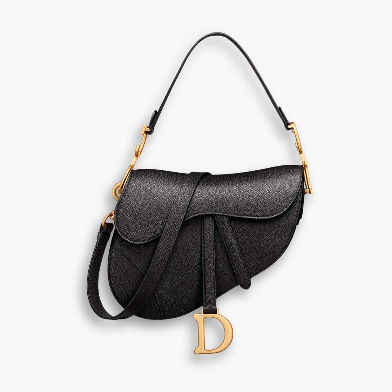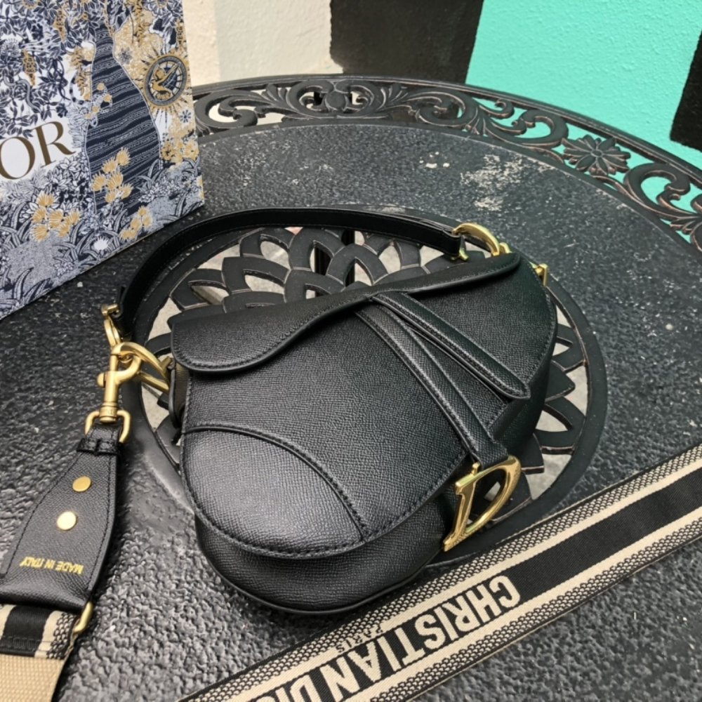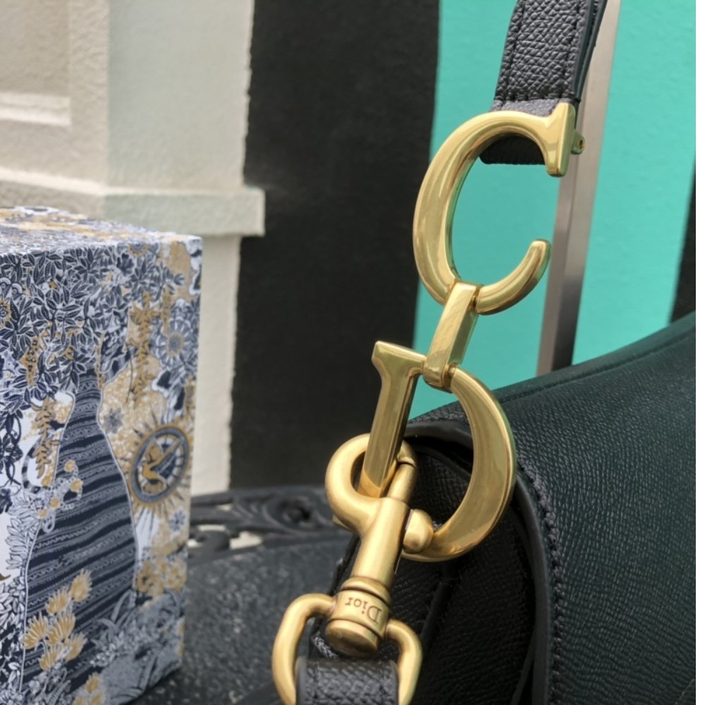 Crafted in black grained calfskin, the legendary design features a Saddle flap with a D stirrup strap and magnetic pull, as well as an antique gold-finish metal CD signature on either side of the handle. Equipped with a thin, adjustable and removable strap, the Saddle bag may be carried by hand, worn over the shoulder or crossbody.