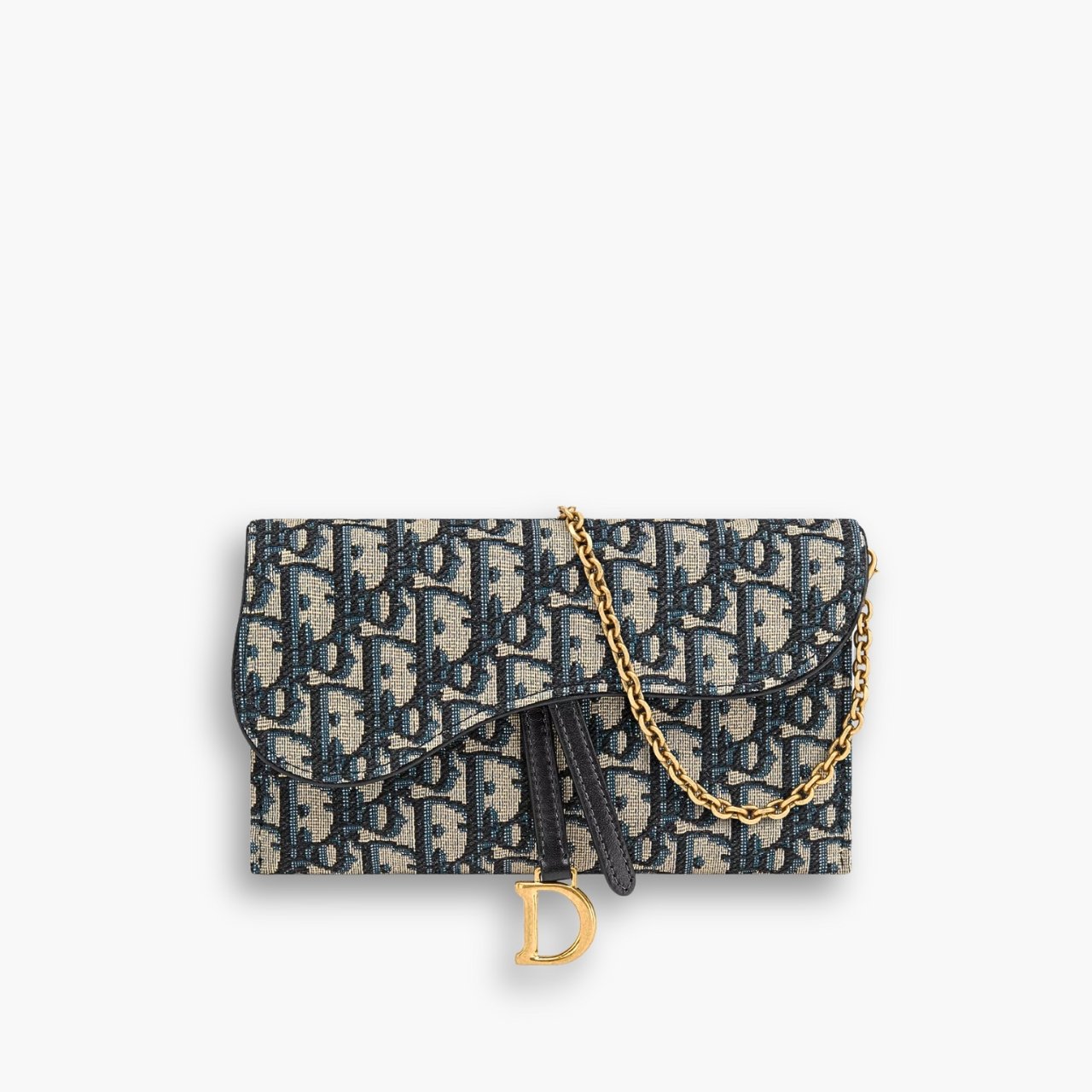 The long Saddle wallet with chain, crafted in blue Dior Oblique jacquard, is a hybrid item with a modern and streamlined design. The style is embellished with an asymmetric flap featuring an antique gold-finish metal D stirrup. Thanks to its removable chain strap, the wallet can be worn over the shoulder, crossbody or carried by hand.
