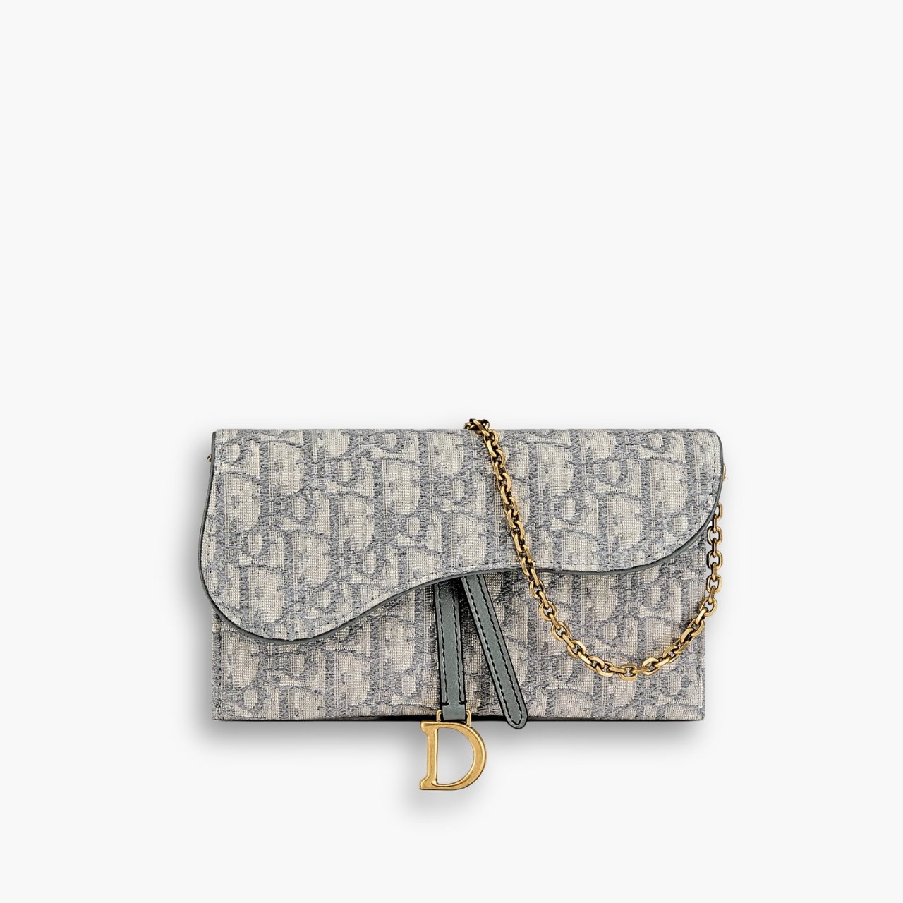 The long Saddle wallet with chain, crafted in Dior Oblique jacquard, is a hybrid item with a modern and streamlined design. The style is embellished with an asymmetric flap featuring an antique gold-finish metal D stirrup. Thanks to its removable chain strap, the wallet can be worn over the shoulder, crossbody or carried by hand.