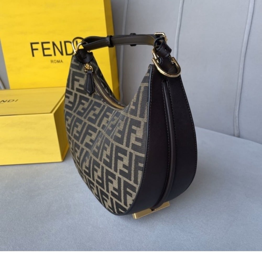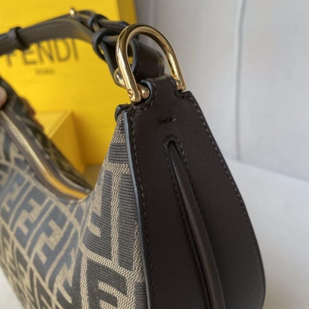 The Fendigraphy small hobo crafted FF jacquard motif fabric and embellished with gold FENDI lettering across the base visible when worn on the shoulder. The adjustable shoulder strap allows for crossbody wear.