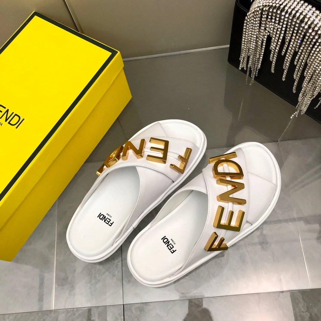 The Fendi Fendigraphy Slides White are a luxurious blend of simplicity and elegance. Crafted from premium black leather, the wide strap provides a snug and comfortable fit. The standout feature is the bold gold-tone “FENDI” logo adorning the side of the sole, adding a striking visual appeal. Designed with a lightweight and durable rubber sole, these slides offer both style and ease,
