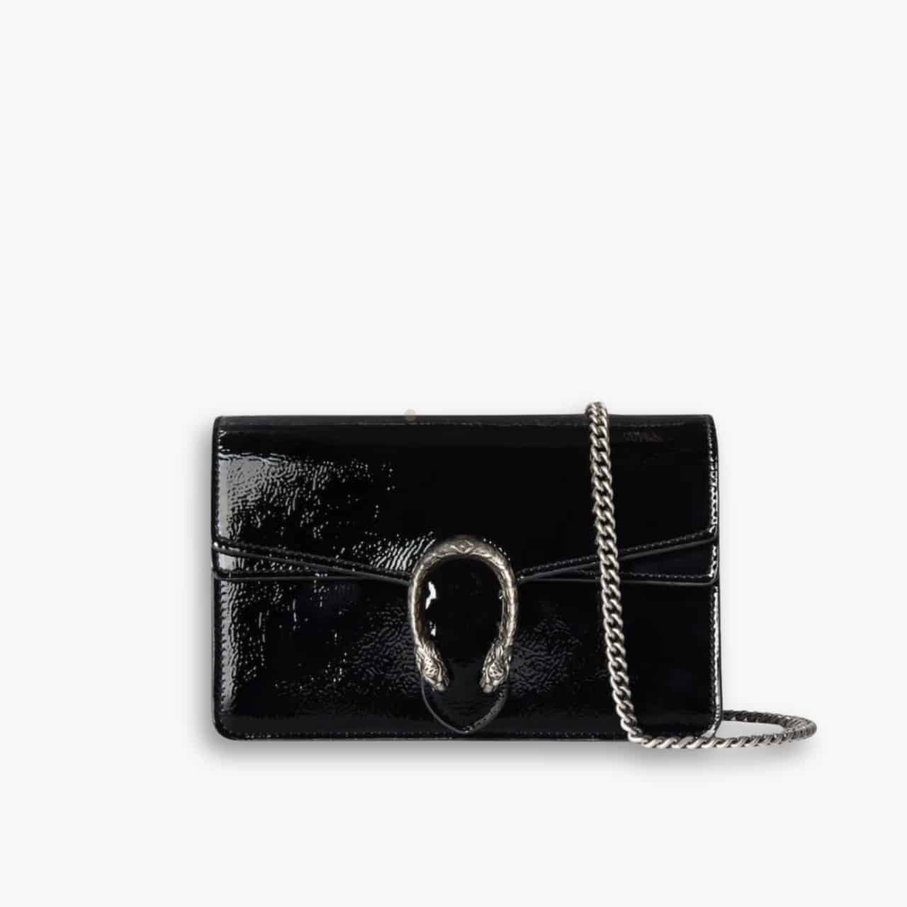 A shiny patent leather brings a fresh take to the Dionysus’ well-structured design, while creating contrast with the signature tiger head hardware in a silver tone. A suede leather lining completes the style with an elegant finish.
