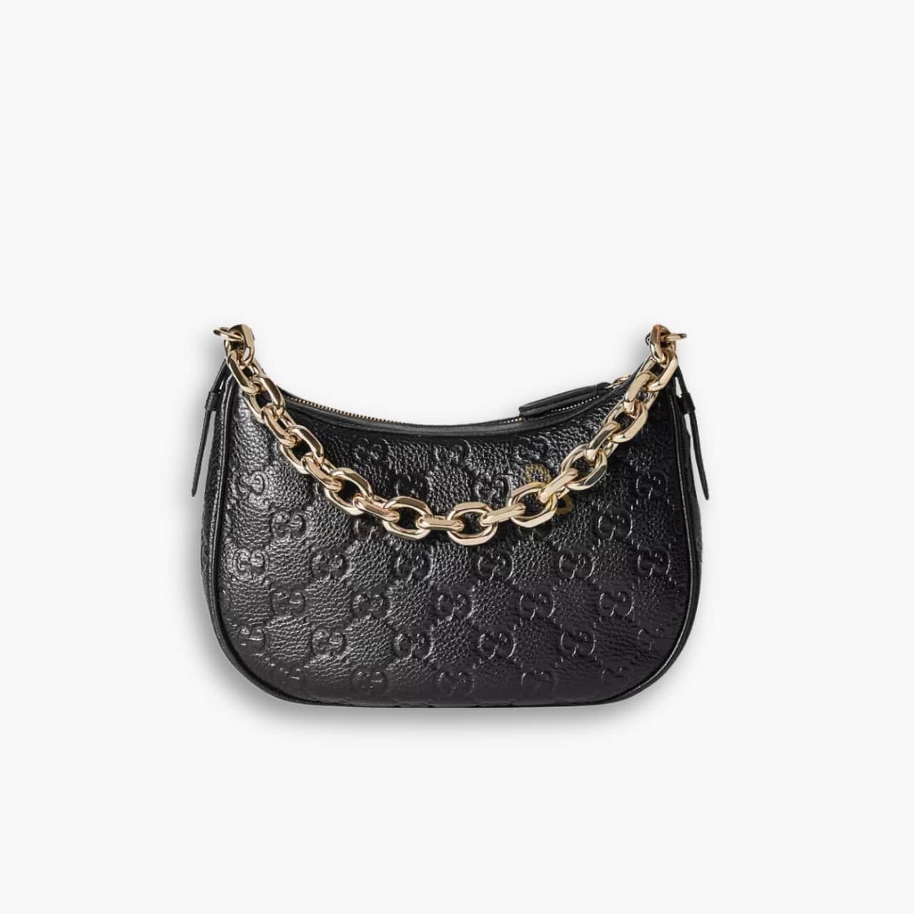 The new GG Emblem collection reinterprets the House’s history of elegance and craftsmanship. This small half moon shoulder bag features a light gold-toned chain, and comes with an additional leather shoulder strap for crossbody wear.
