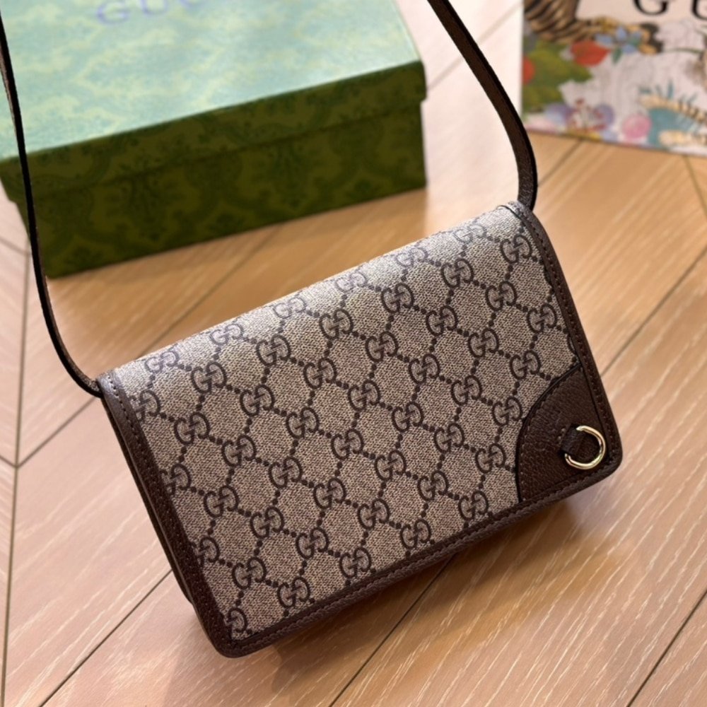 The GG Emblem collection reinterprets signature motifs through creativity and innovative functions , and is envisioned to be cherished for years to come. Introduced in the latest line of small accessories, this beige and dark brown super mini shoulder bag is crafted from the new GG Monogram fabric. Featuring multiple compartments, it also features the D-ring for attachments.