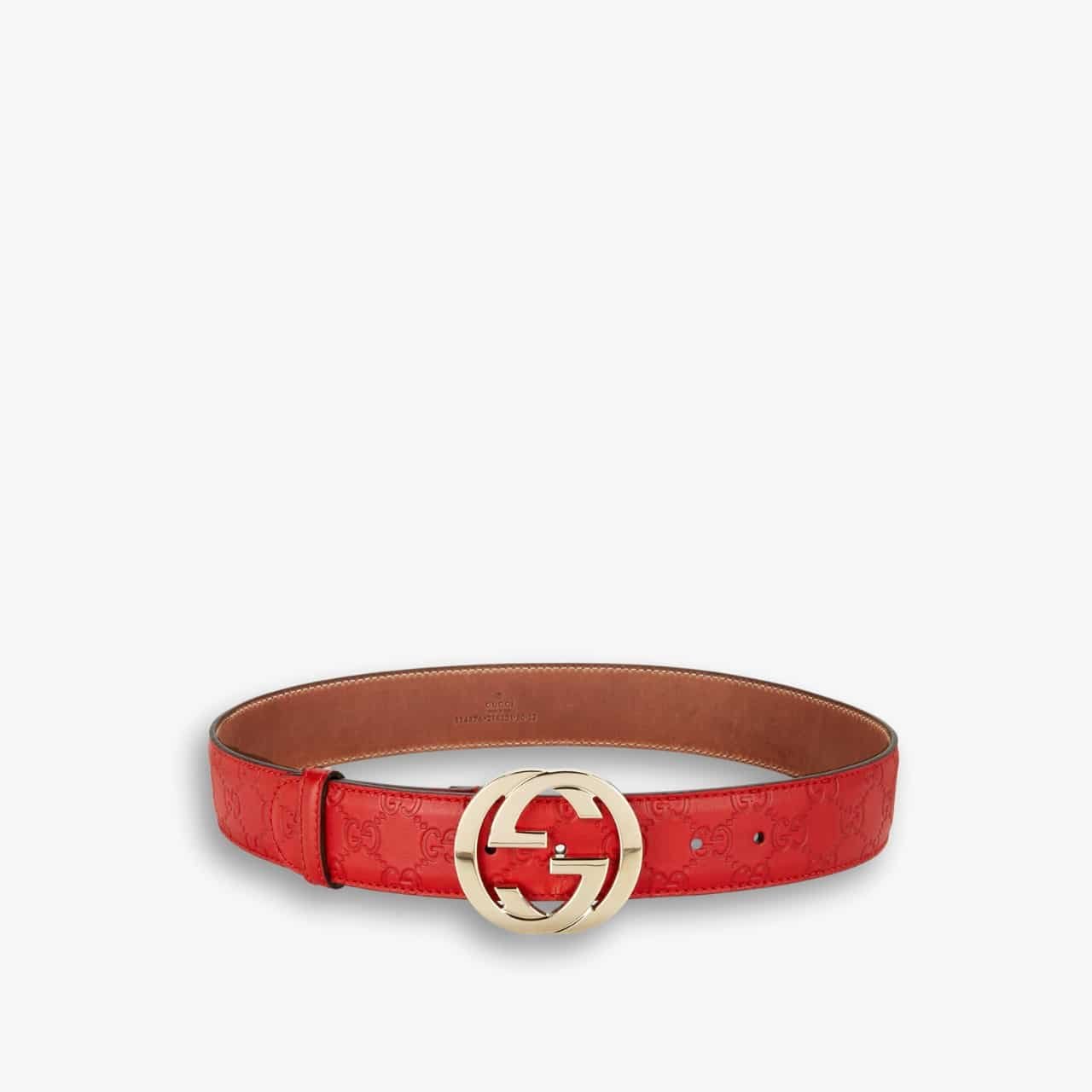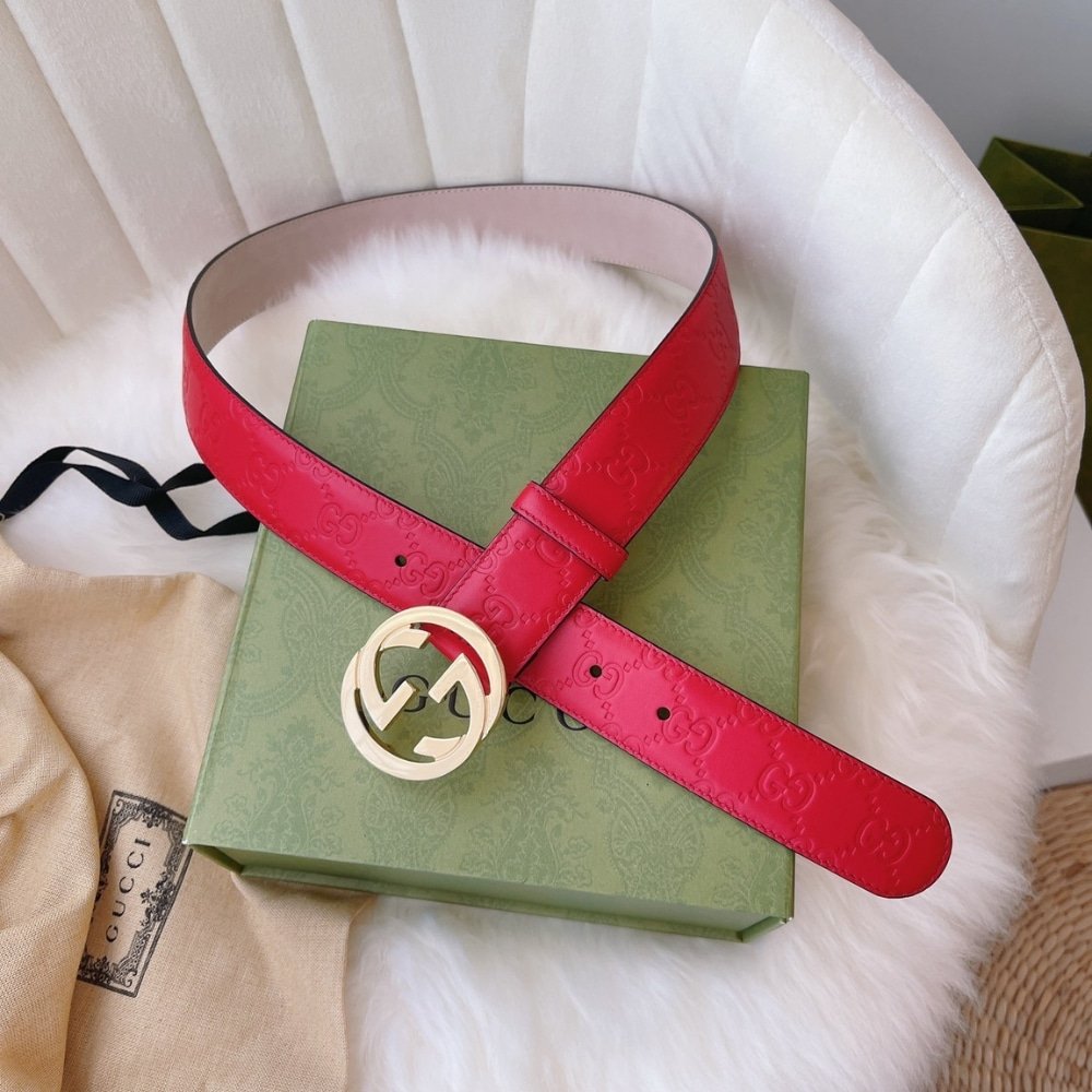The monogram defines this belt crafted from Gucci Rosso Ancora red GG embossed leather with a soft and silky touch. The Interlocking G buckle completes the accessory with a unique feel.