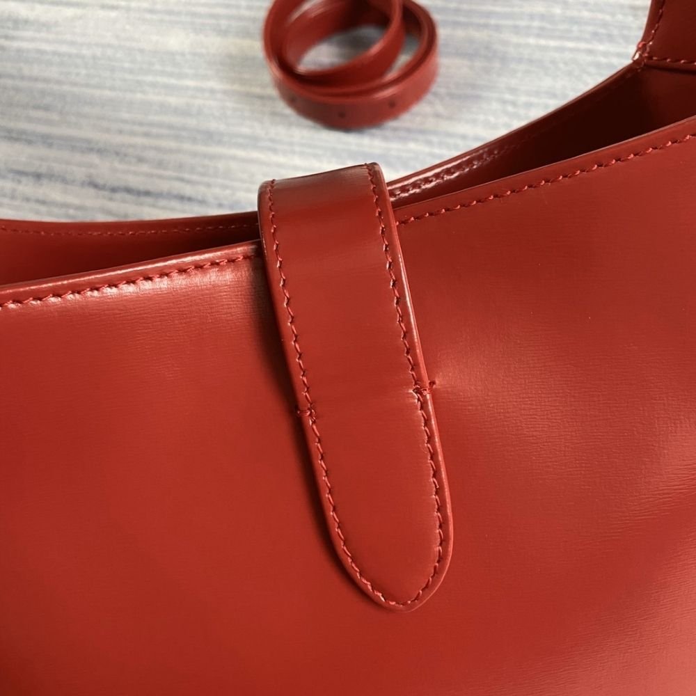 The Gucci Jackie 1961 shoulder bag with light gold-toned piston closure features red leather, highlighting the craftsmanship, crescent shape, and sleek silhouette of the House’s iconic handbag.