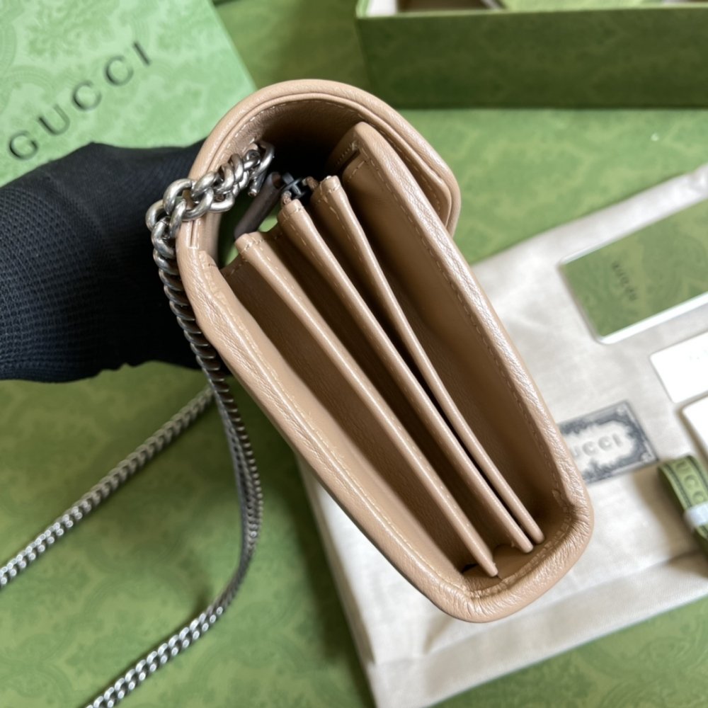 It features an optional aged silver chain-link shoulder strap and a crossover flap with an interlocking aged gold GG logo. This opens to a beige leather interior with a zipper compartment, patch pockets, and card slots.
