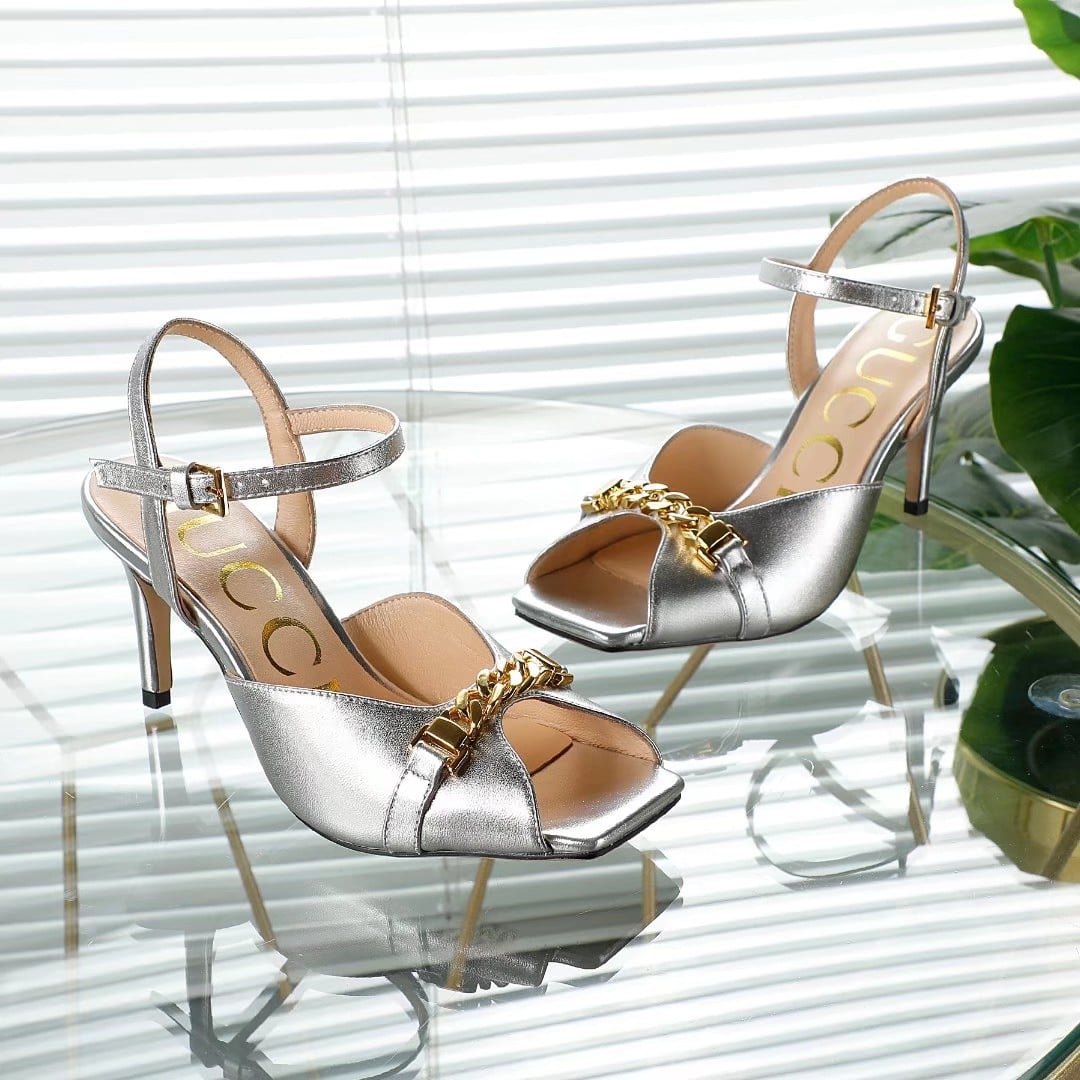 Make a bold fashion statement with the Gucci Metal Chain Heels Sandals. These luxurious, modern sandals feature an open-toe design and a high stiletto heel, crafted from premium leather. The striking metallic chain detail adds a touch of glamour and sophistication, making these sandals a standout choice for any outfit. Perfect for any occasion, they bring confidence and high fashion to your look.