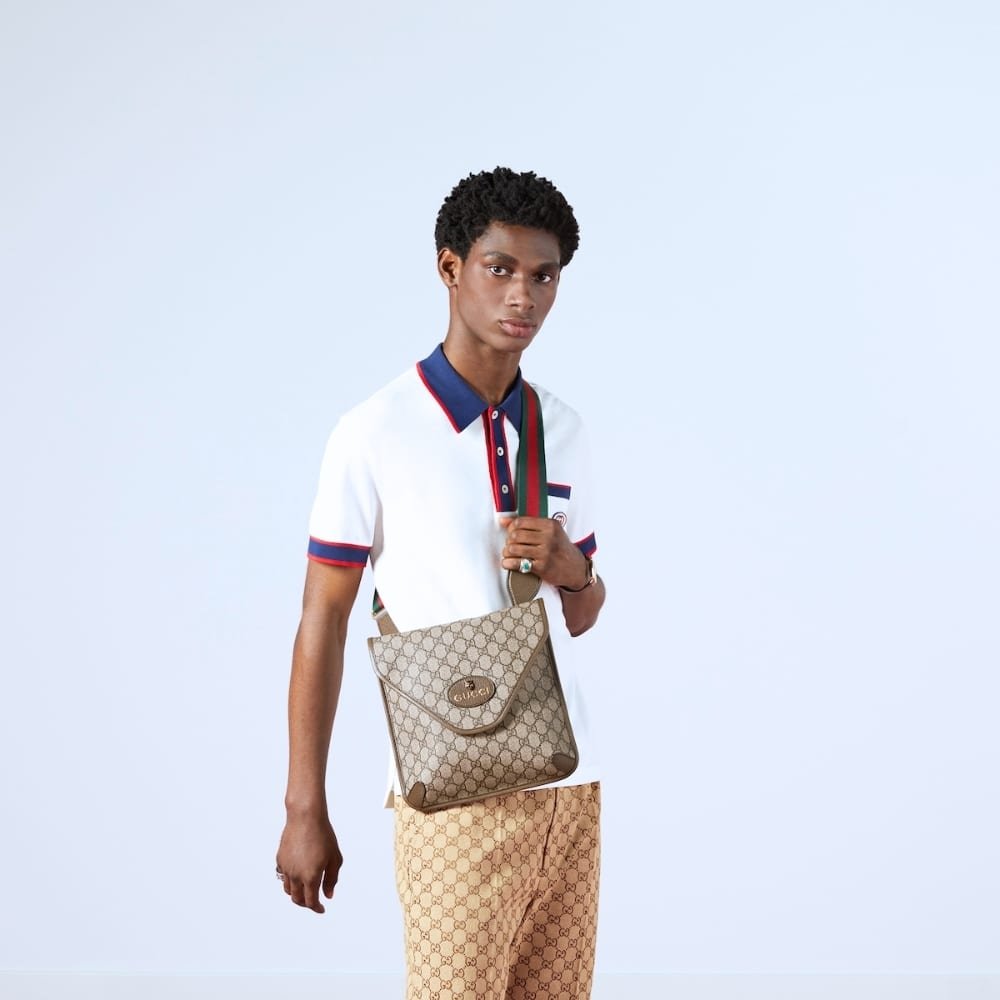 The medium messenger bag is part of a collection of vintage inspired leather accessories in GG Supreme featuring an oval leather tag with metal feline head, a now-established code of the House. The slim design has a magnetic flap closure and is completed with an adjustable nylon strap featuring the House Web colors.
