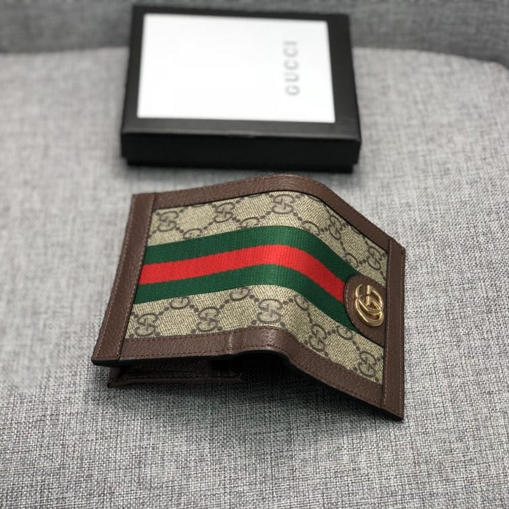 Gucci Ophidia Wallet in a beige and brown color scheme. The wallet features the iconic Gucci monogram canvas and a distinctive red and green stripe.