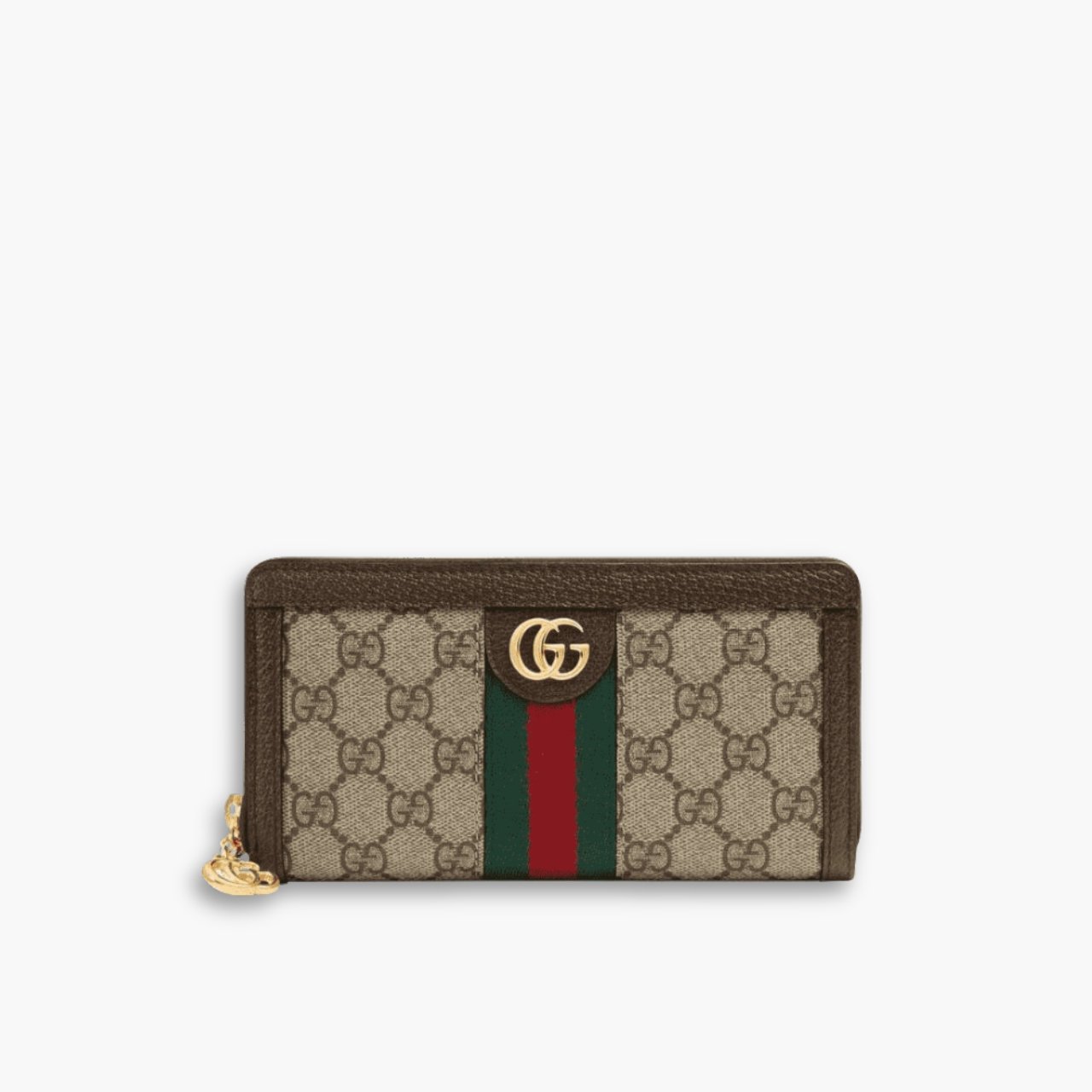 Gucci Ophidia GG Zip Around Wallet in a beige and brown color scheme. The wallet features the iconic Gucci monogram canvas and a distinctive red and green stripe.