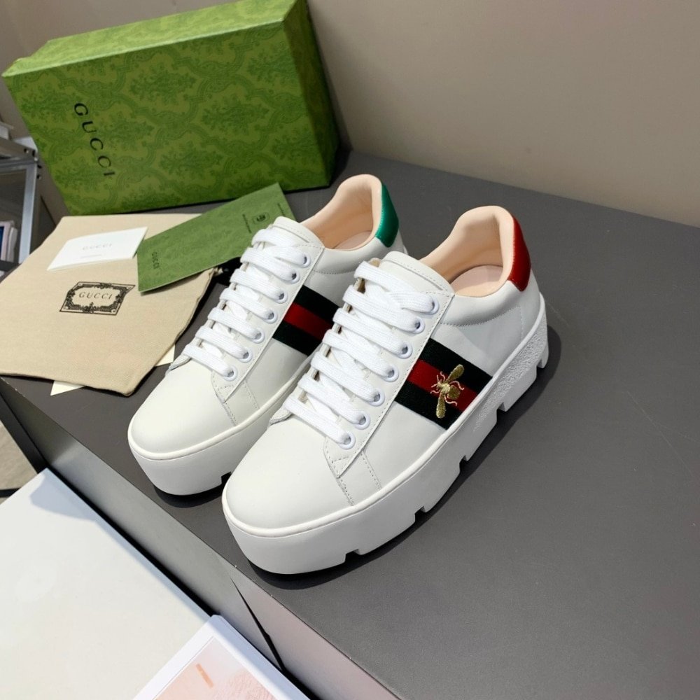 The classic Ace sneaker is set on a platform and shows the metallic gold bee against the Gucci Web. Since its debut, the Ace sneaker has become a mainstay of Gucci collections. The retro design is originally inspired by a Gucci sneaker from the 1970s and is continually reinterpreted and reintroduced into the new eclectic House narrative.