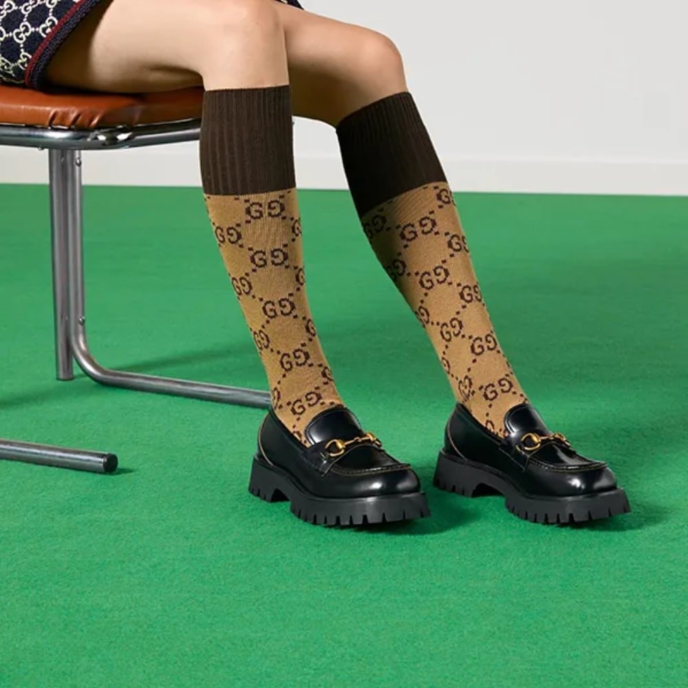 The Gucci Women’s Leather Lug Sole Loafer in Black (577236 DS800 1000) combines timeless elegance with a modern edge. Crafted from premium black leather and featuring a sturdy lug sole, this loafer offers both sophistication and durability, making it a versatile choice for any wardrobe.