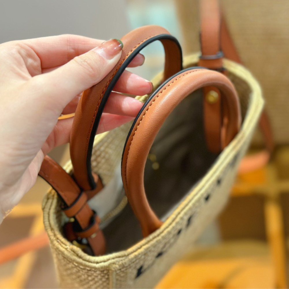 The Standard tote is a simple design with a clean silhouette and pragmatic shape, finished with calfskin top handles and a contrasting LOEWE signature. This A5 version using raffia leaves that have been cultivated, harvested, sun-dried and handwoven.