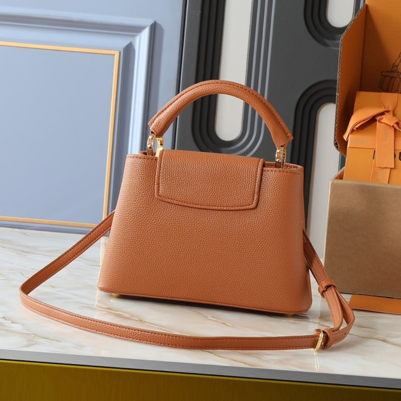 The Louis Vuitton Capucines BB in Tan Brown combines classic sophistication with modern functionality. It showcases the iconic LV signature and a structured, elegant form. With its top handle and removable strap.