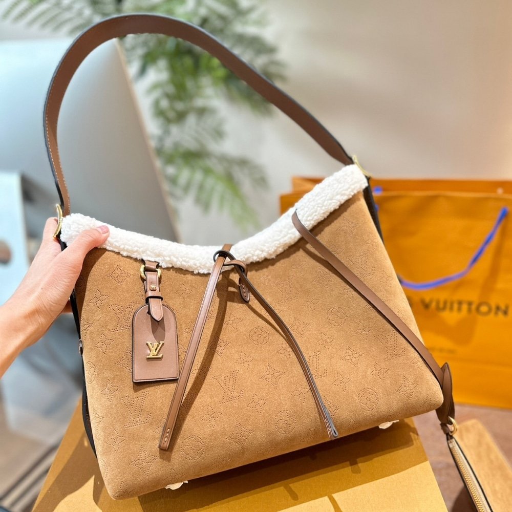 The “Carryall NM PM” from the “LV SKI” collection is an iconic item updated with a warm style and luxurious atmosphere perfect for winter. Made from Mahina suede leather decorated with monogram perforations and trimmed with Merino shearling for a soft feel. The generous design with a magnetic closure and leather lace can hold a long wallet and everyday essentials.