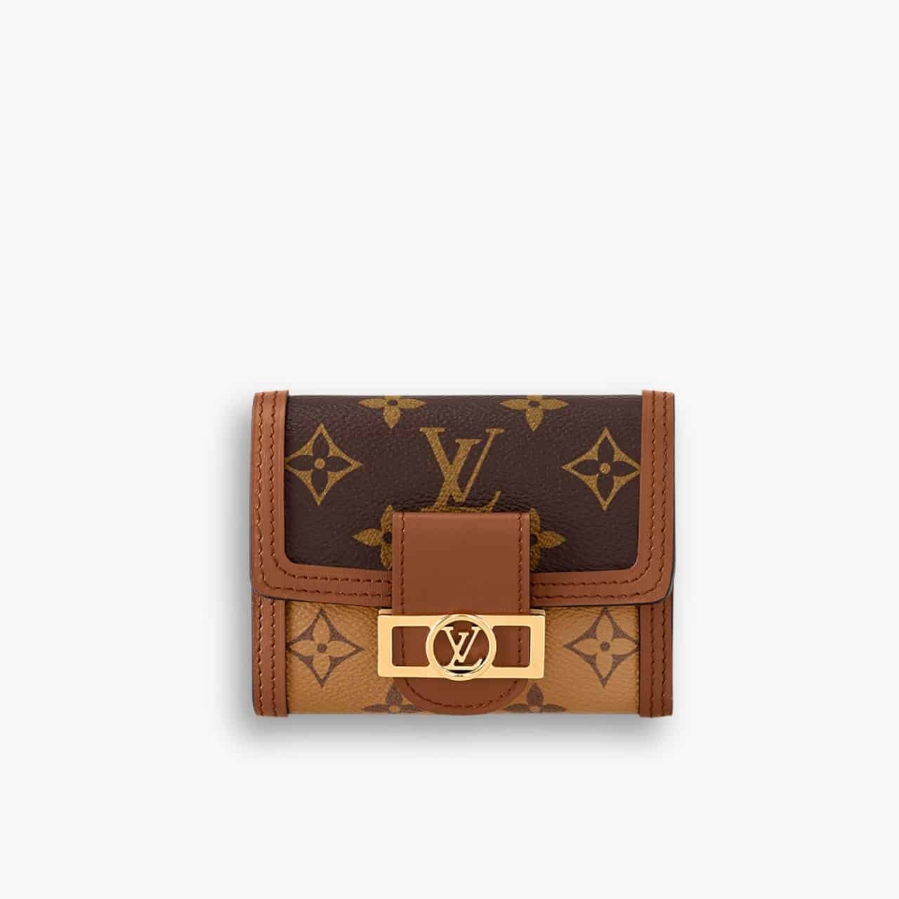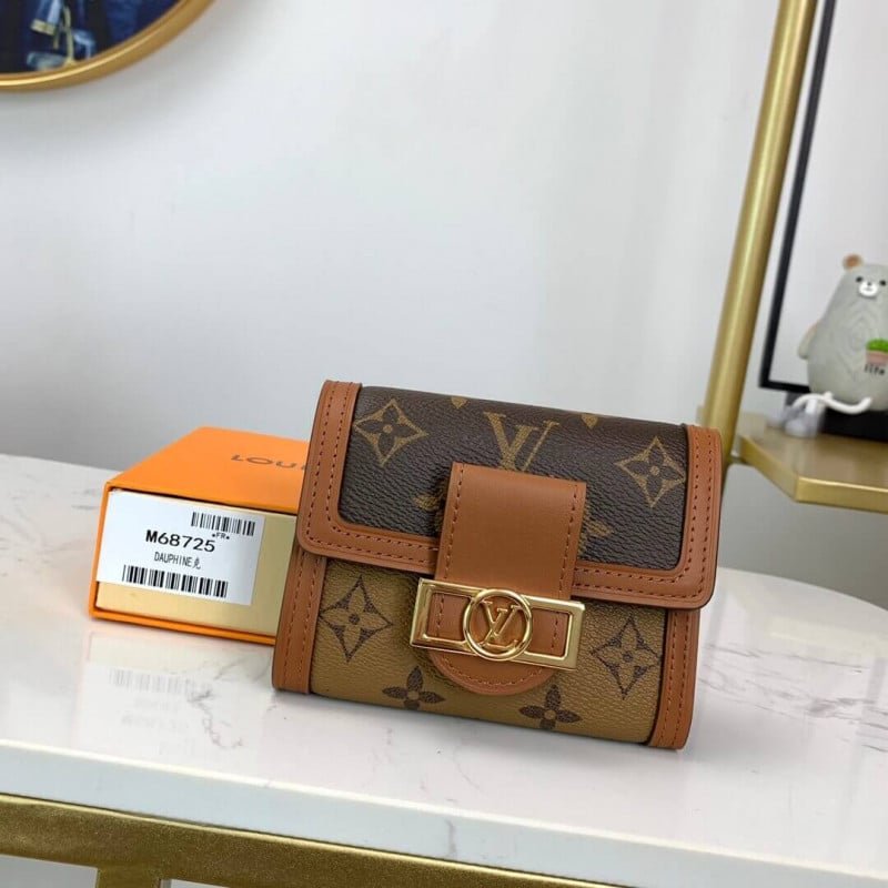 The Louis Vuitton Dauphine Compact Wallet (M68725) in Brown is a timeless blend of heritage and modern functionality. Crafted from the signature Monogram and Monogram Reverse canvas, this wallet features refined leather trim and a gold-tone LV magnetic closure for a sophisticated touch. Its compact yet spacious design includes multiple card slots, a bill compartment, and a secure coin pocket, making it an elegant and practical everyday essential.