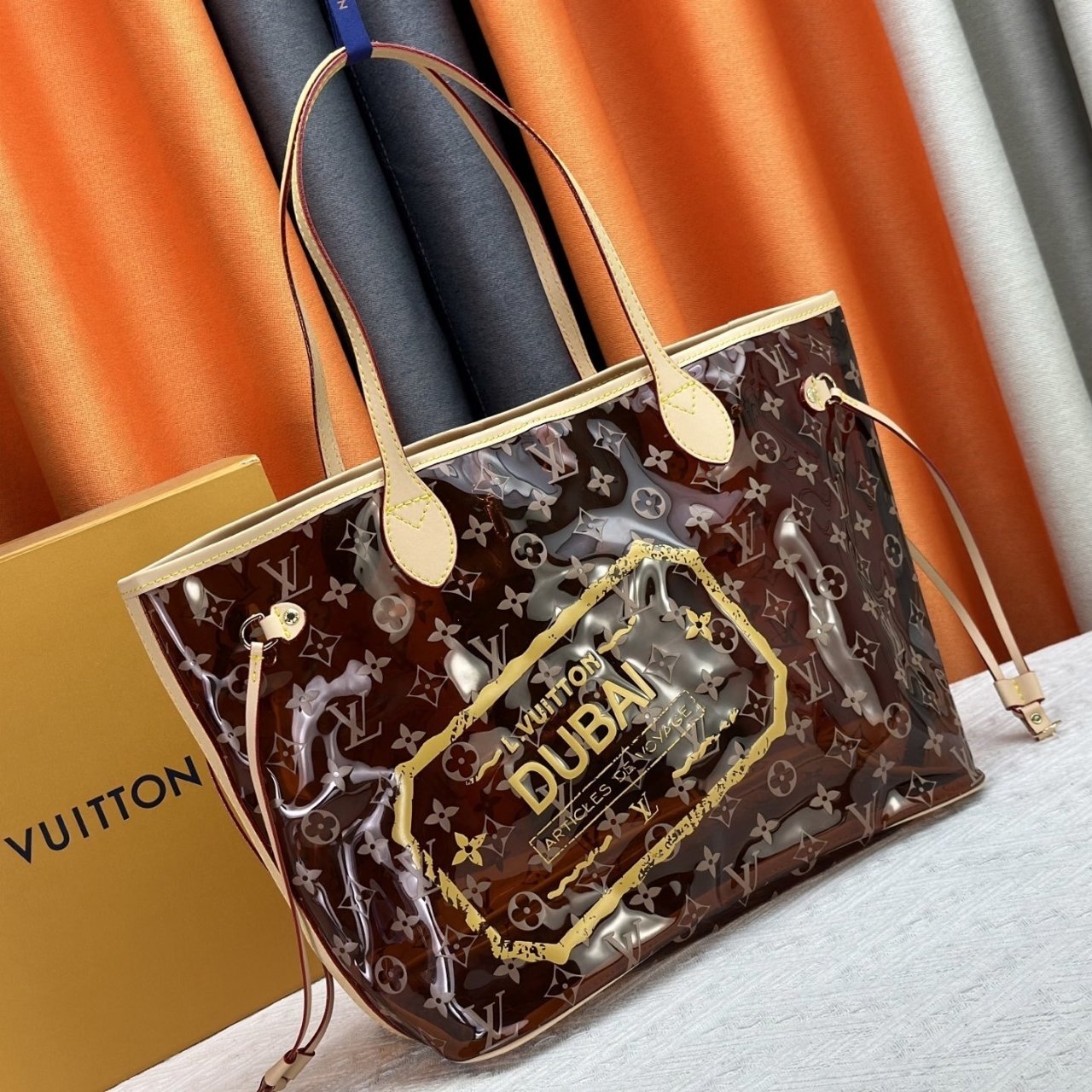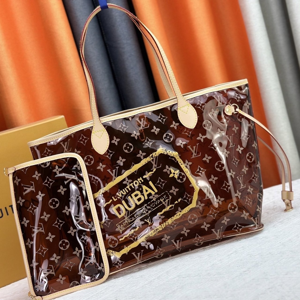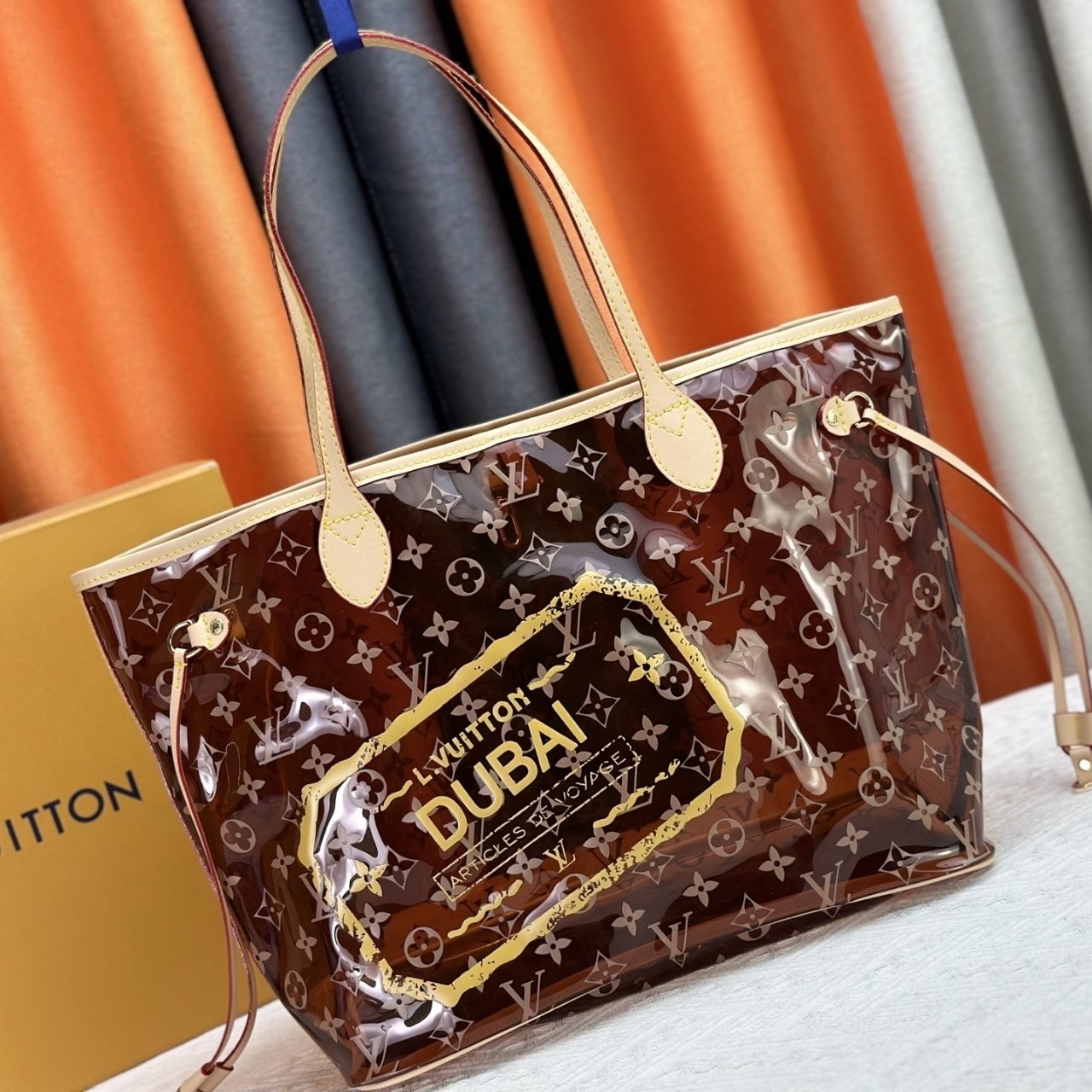 This Louis Vuitton tote bag features the classic Monogram pattern with a glossy PVC overlay. It has beige trim and handles, along with a detachable matching pouch. The front is highlighted with a bold yellow “Louis Vuitton Dubai” print, giving it a limited-edition travel-inspired look.