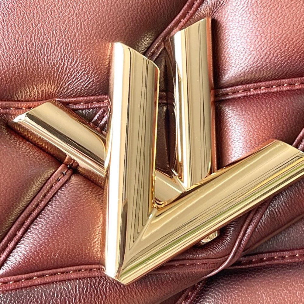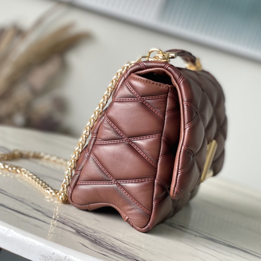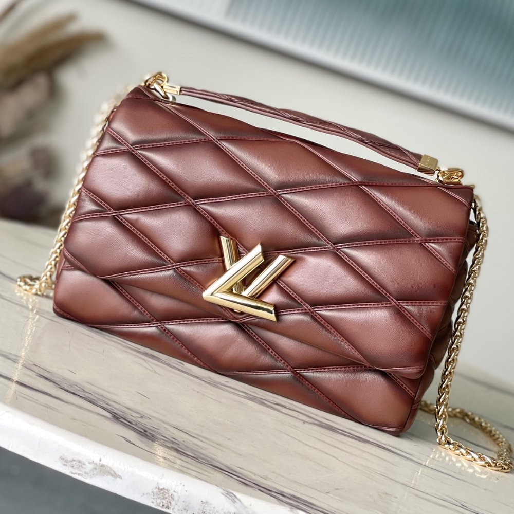 Louis Vuitton GO-14 MM Tan 31Cm . Nicolas Ghesquière explores new techniques to embellish the GO-14 MM handbag. Here padded lambskin is quilted, and a refined toasted effect is applied by hand, giving it a futuristic allure. The top handle and adjustable chain – both detachable – enable carry options. It’s signed with the House’s emblematic LV Twist lock.