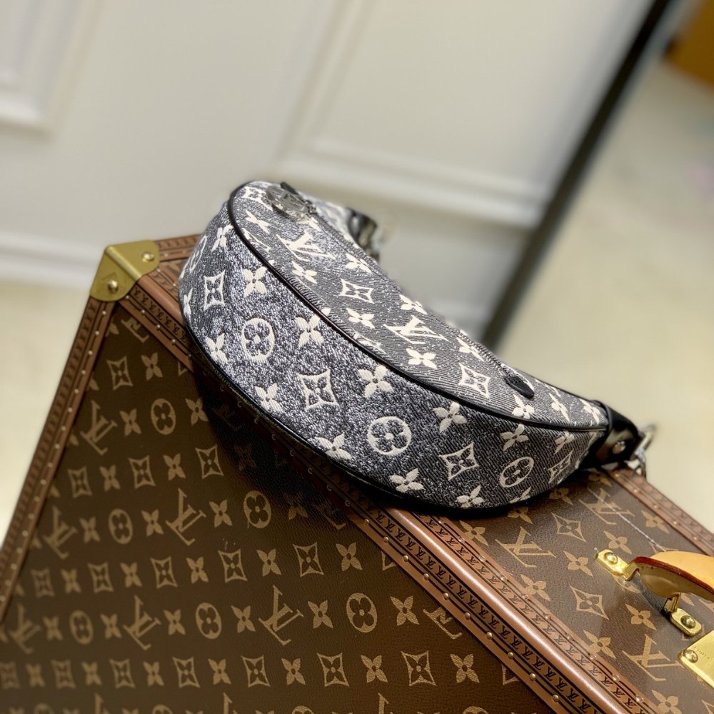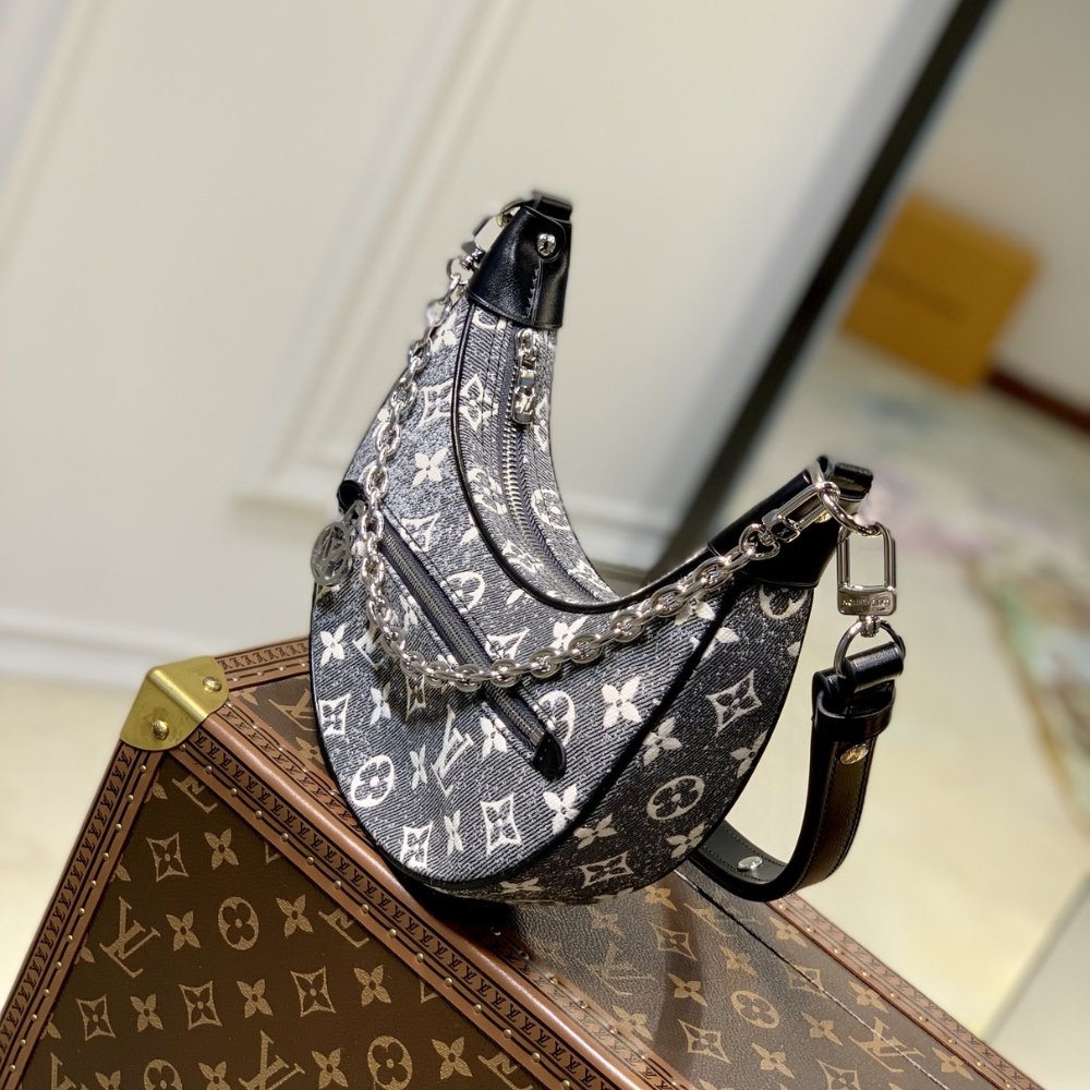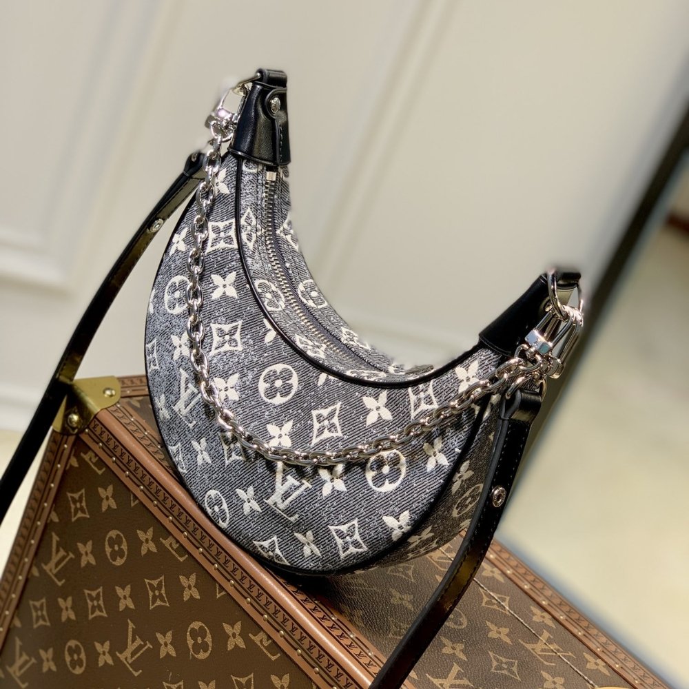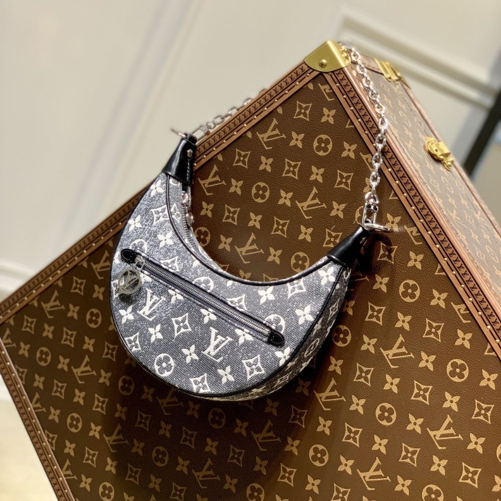This edition of the Loop PM bag wears new Monogram Jacquard Denim, introduced at the Cruise 2023 show. The gray colorway and stone-washed effect give the bag a modern rawness, in contrast to the gleaming silver-tone hardware. The reverse jacquard lining lends a surprising touch; the Louis Vuitton Circle zip pull adds a signature flourish.