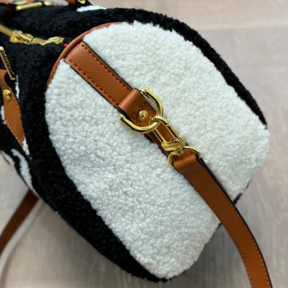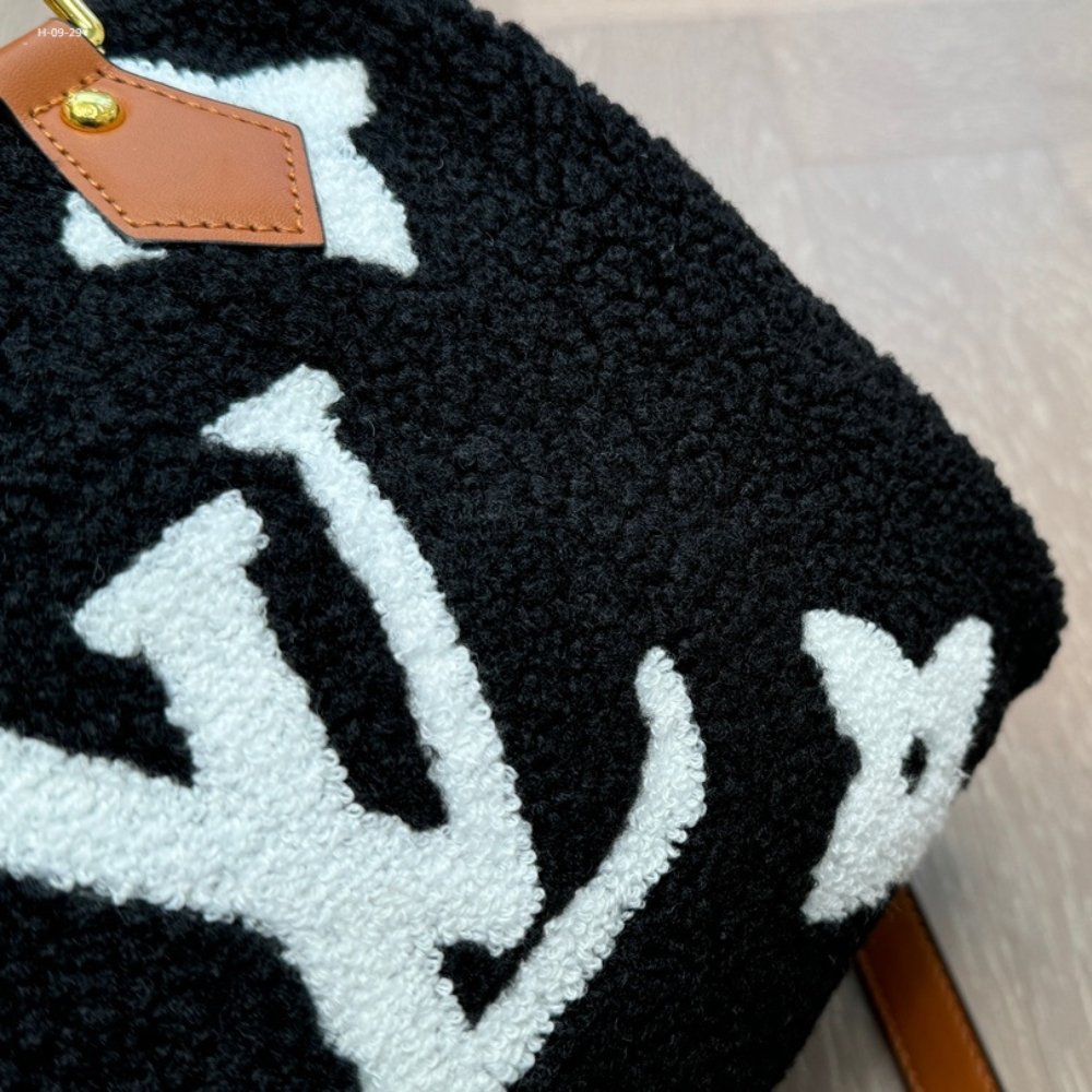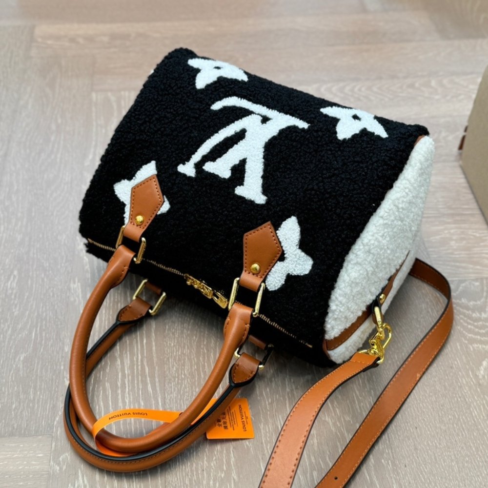 The Louis Vuitton Monogram Teddy Speedy Bandouliere in Black White, measuring 25 cm, is a cozy yet chic handbag. Crafted from soft shearling with cowhide leather trim, it features a textile lining and gold-tone hardware for a luxurious touch. The lined zip closure and inside zipped pocket add practicality to this stylish, compact bag, making it a perfect accessory for both casual and polished looks.
