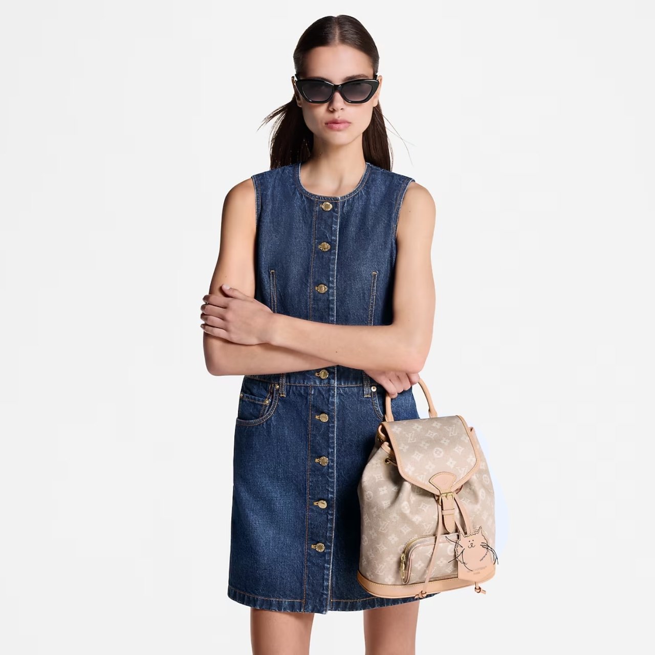 Part of the LV Travels With collection, this edition of the Montsouris PM features a playful Meowgram pattern designed by fashion icon and artist Grace Coddington. Celebrating her love of felines, it is crafted from canvas and features a removable cat-shaped keybell. Inside, there is enough room to store daily essentials, including a compact wallet.