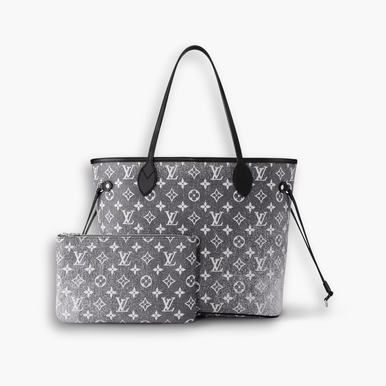 The Neverfull MM tote is refreshed once again this season, featuring Monogram Jacquard Denim. The intentionally stone-washed, raw effect of the material adds a modern touch to this iconic bag. It is adorned with contrasting black leather handles and trim, complemented by silver-finish hardware, creating a stylish and contemporary look.