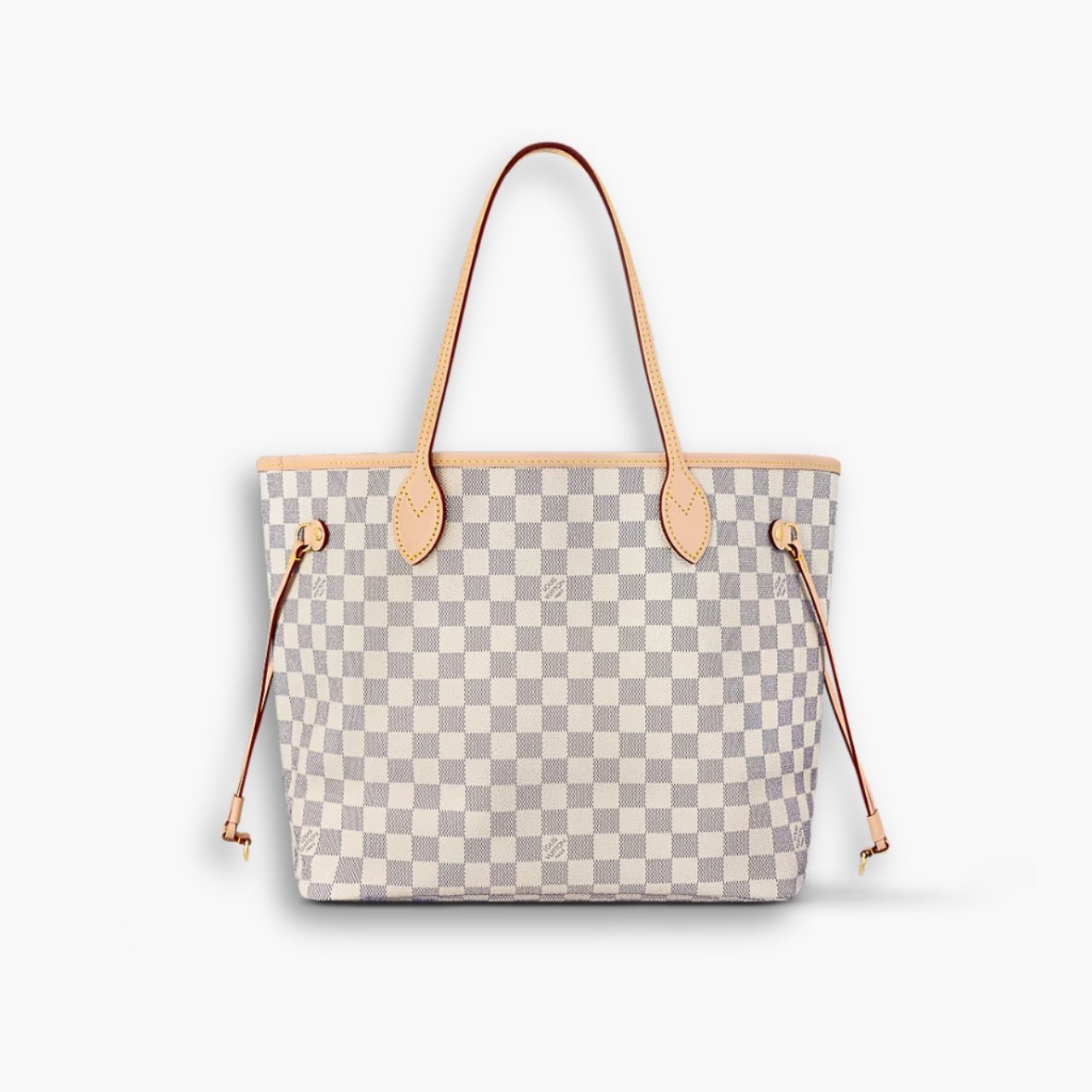 The Neverfull MM tote unites timeless design with heritage details. Made from fresh Damier Azur canvas with natural cowhide trim, it is roomy yet not bulky, with side laces that cinch for a sleek allure or loosen for a casual look. It features a removable pouch which can be used as a clutch or an extra pocket.
