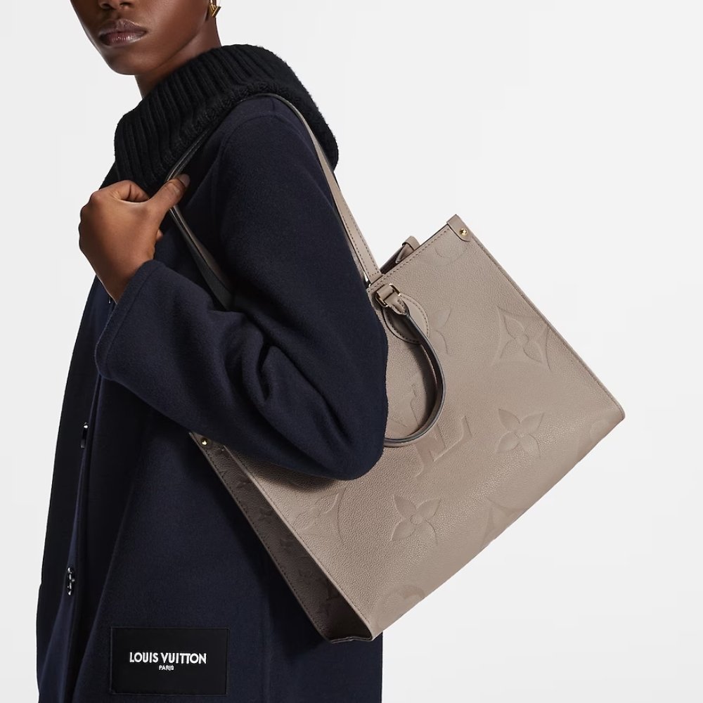 For Spring 2021, Louis Vuitton launches the Onthego MM tote bag in grained Monogram Empreinte, a soft leather that is embossed with a large and modern Monogram pattern. Thanks to the square shape, it boasts a generous capacity and can easily fit a laptop.