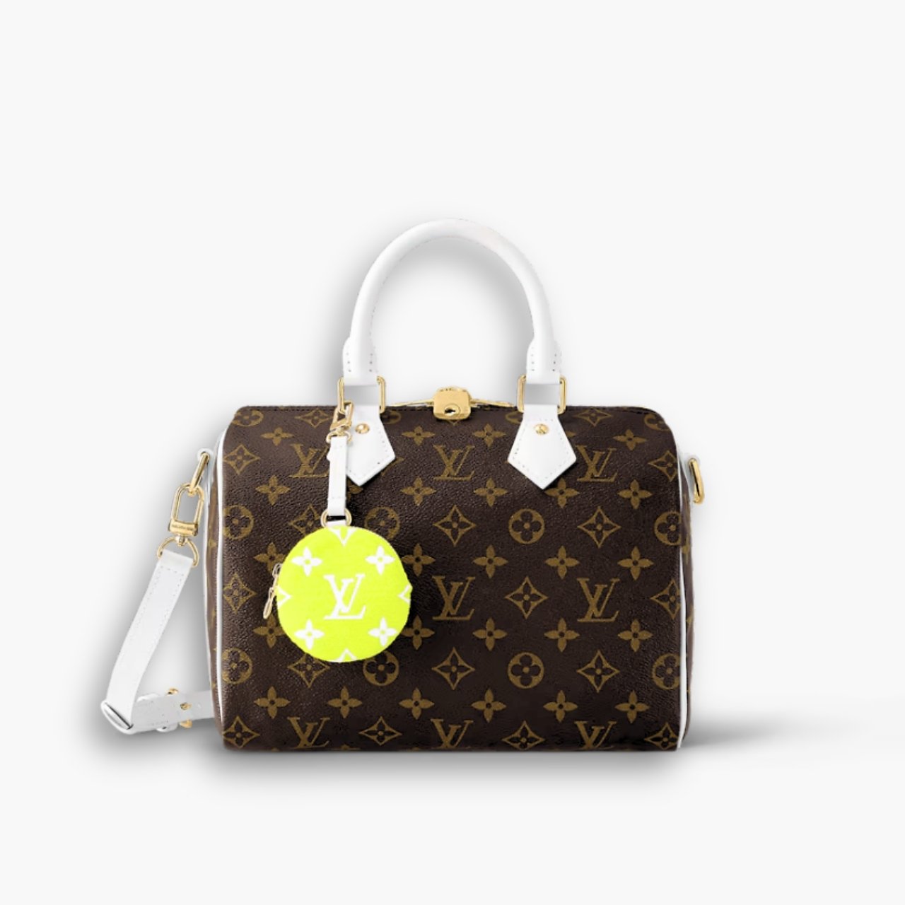 Classic Monogram canvas is combined with white-leather trim on this sporty Speedy Bandoulière 25 handbag. Finished with a Round Zippy Coin Purse colored like a tennis ball, this Speedy is Nicolas Ghesquière’s nod to the world of tennis. The top handles and detachable shoulder strap enable different carry options.