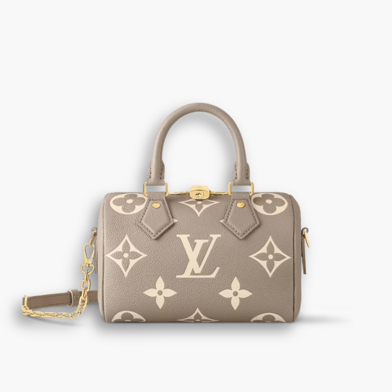 Made from two-tone Monogram Empreinte leather with the LVs and Monogram Flowers in a cream color, the Speedy Bandoulière handbag is a modern classic. Inspired by the House’s Speedy luggage line introduced in the 1930s, it features the same shape and articulated top handles.
