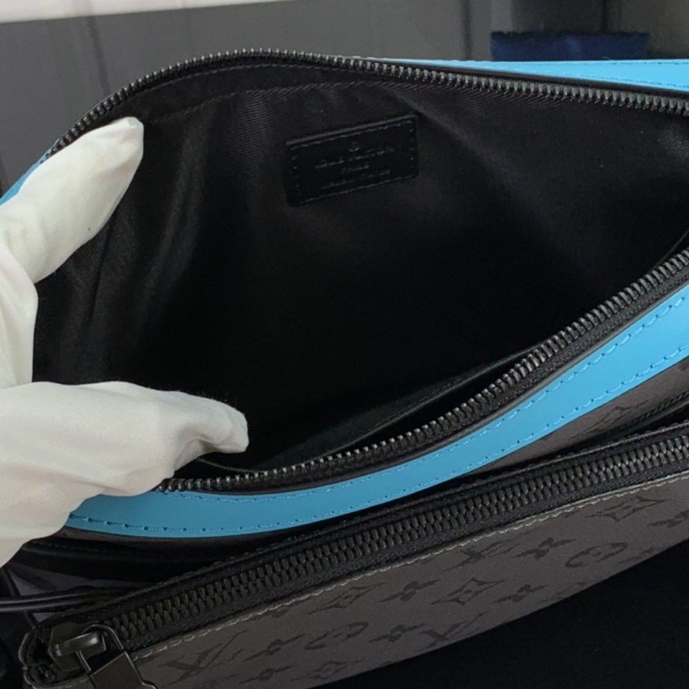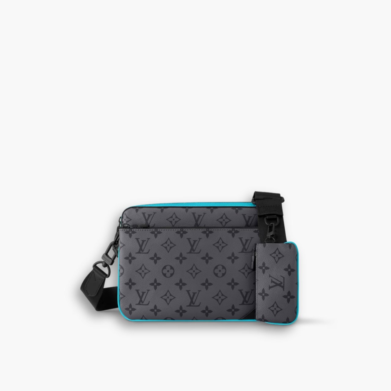 The Louis Vuitton Trio Messenger in Turquoise (25cm) combines style and versatility with its Monogram Eclipse Reverse canvas and eye-catching turquoise accents. Featuring three functional components— the main pouch, a detachable zipped pocket, and a removable coin purse— this bag offers a practical design. The adjustable, removable textile strap adds comfort for shoulder wear, while the Louis Vuitton signature completes the look.