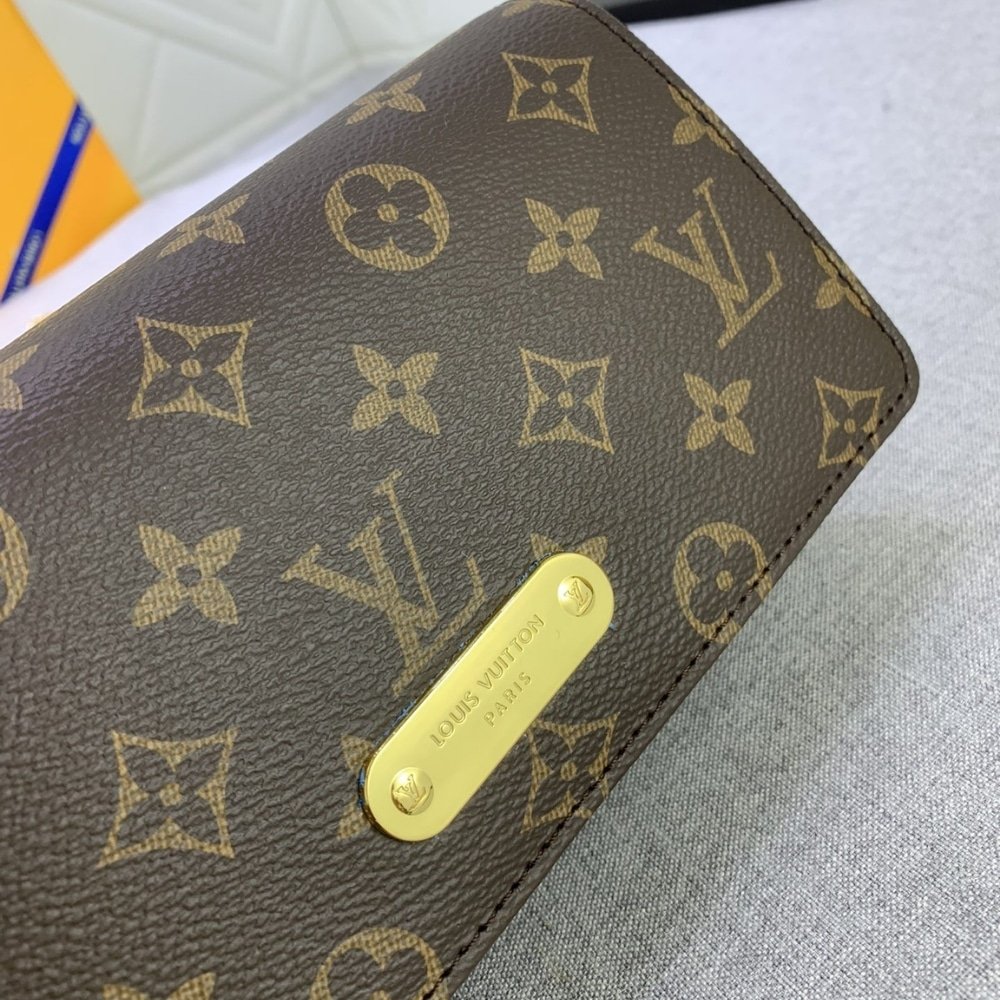 The Lily wallet on chain in Monogram canvas combines a sleek rectangular shape with a subtle retro look. Its flap features a gold-tone plate embellished with rivets and engraved with the Louis Vuitton signature. Large enough to carry essentials from day to evening, it offers different carry options thanks to its removable, adjustable chain with an LV Circle charm.