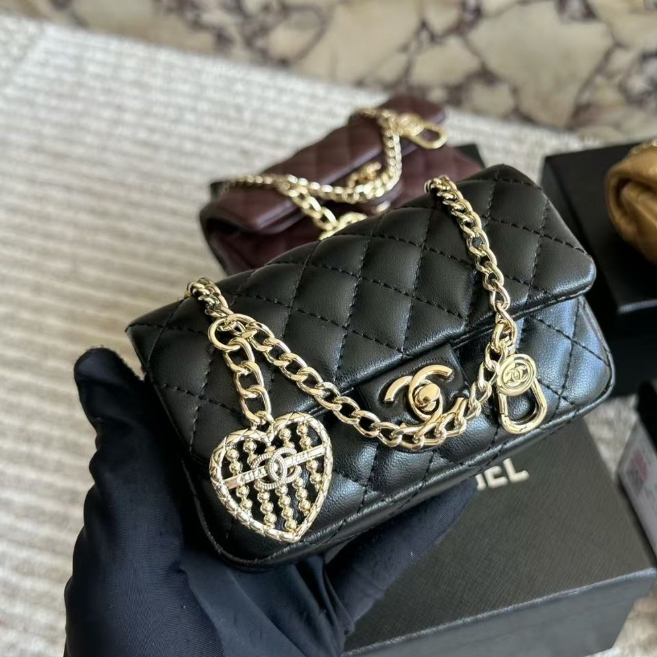 This Chanel mini flap bag has black with gold-tone hardware. It features the iconic CC turn-lock closure and a chic chain handle. A pearl and crystal heart charm adds a touch of elegance and playfulness.
