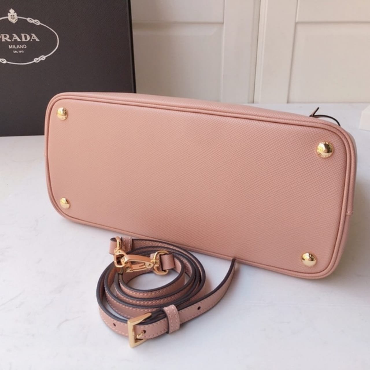 The Prada Large Galleria Bag in Cameo pink is crafted from iconic Saffiano leather, known for its durability and crosshatch texture. Measuring 32cm, it features a structured silhouette with dual zip compartments and gold-tone hardware. Timeless and refined, it’s the perfect blend of elegance and everyday functionality.