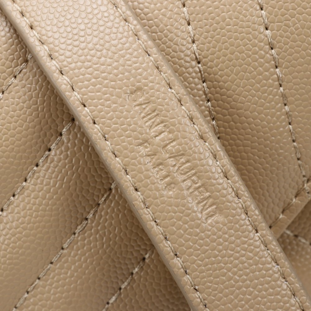 The Saint Laurent Envelope Small Bag in Dark Toppee is a timeless accessory crafted from lambskin, showcasing elegant vertical, chevron, and diamond quilted topstitching. At 21cm, this versatile bag features bronze-toned hardware and a sliding leather-and-chain strap for two stylish carrying options. The luxurious grosgrain lining adds a refined touch to this chic piece.
